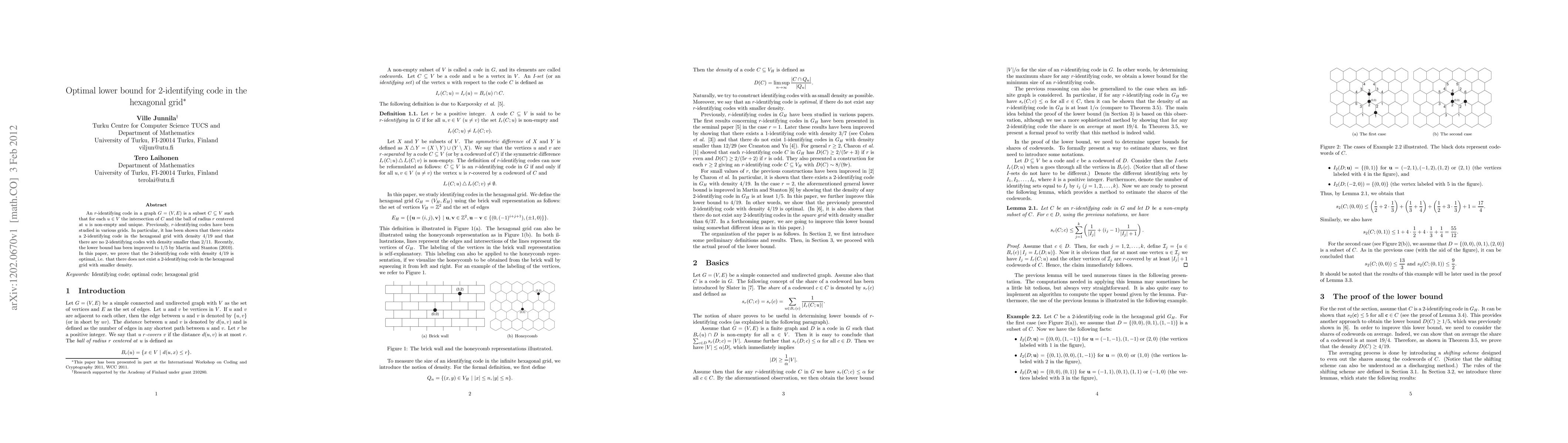 This paper proves that the 2-identifying code with a density of 4/19 in the hexagonal grid is optimal, confirming that no 2-identifying code with a smaller density exists. This resolves the lower bound previously improved to 1/5 by Martin and Stanton (2010).