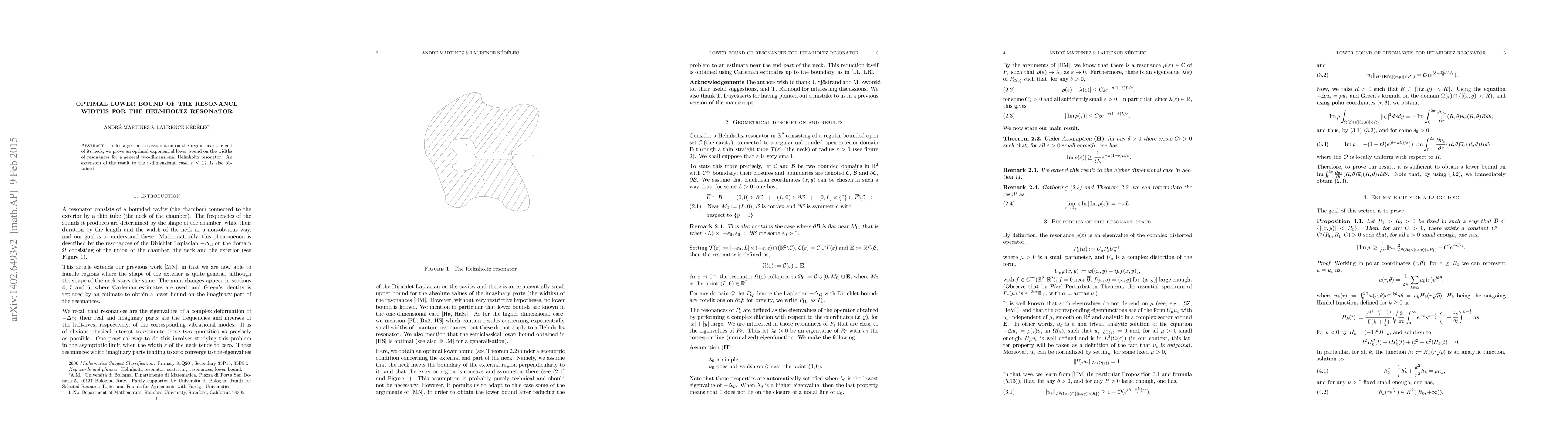 This research establishes an optimal exponential lower bound for the resonance widths of two-dimensional Helmholtz resonators under specific geometric conditions near the neck. The findings extend to n-dimensional cases for n less than 12.