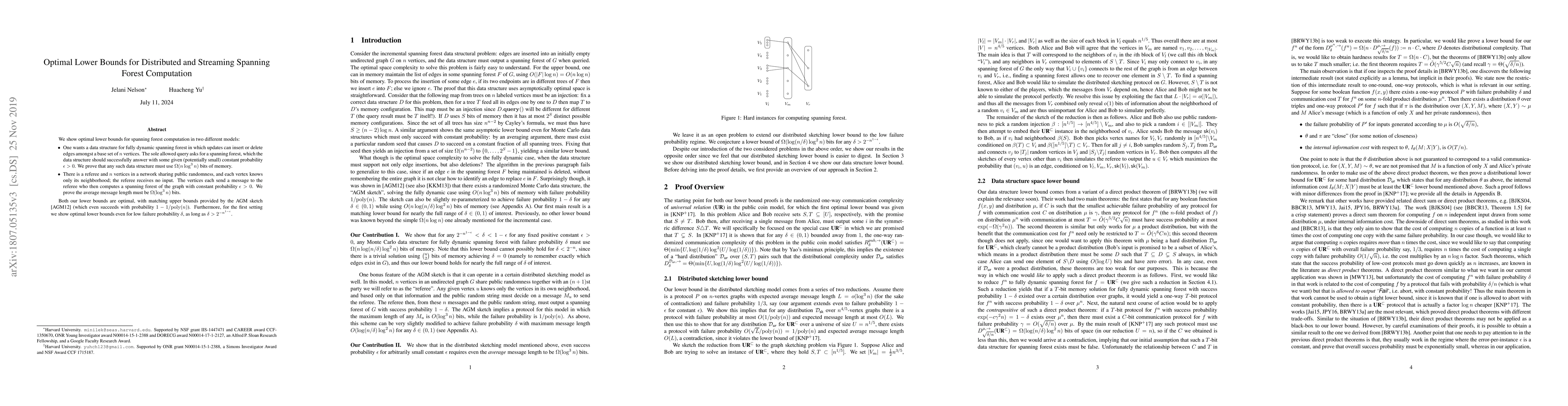 This paper establishes optimal lower bounds for spanning forest computation in two models: a fully dynamic data structure and a distributed streaming model. It proves that both require $\Omega(n\log^3 n)$ bits for memory and message length, respectively, with matching upper bounds provided by the AGM sketch.