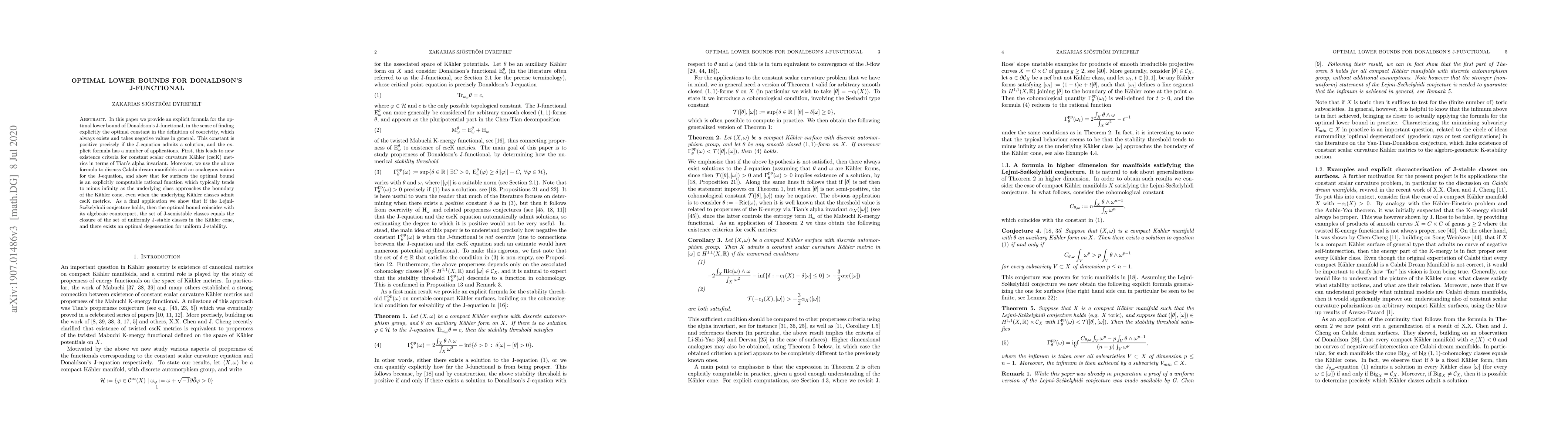 In this paper we provide an explicit formula for the optimal lower bound of Donaldson's J-functional, in the sense of finding explicitly the optimal constant in the definition of coercivity, which always exists and takes negative values in general. This constant is positive precisely if the J-equation admits a solution, and the explicit formula has a number of applications. First, this leads to new existence criteria for constant scalar curvature K\"ahler (cscK) metrics in terms of Tian's alpha invariant. Moreover, we use the above formula to discuss Calabi dream manifolds and an analogous notion for the J-equation, and show that for surfaces the optimal bound is an explicitly computable rational function which typically tends to minus infinity as the underlying class approaches the boundary of the K\"ahler cone, even when the underlying K\"ahler classes admit cscK metrics. As a final application we show that if the Lejmi-Sz\'ekelyhidi conjecture holds, then the optimal bound coincides with its algebraic counterpart, the set of J-semistable classes equals the closure of the set of uniformly J-stable classes in the K\"ahler cone, and there exists an optimal degeneration for uniform J-stability.