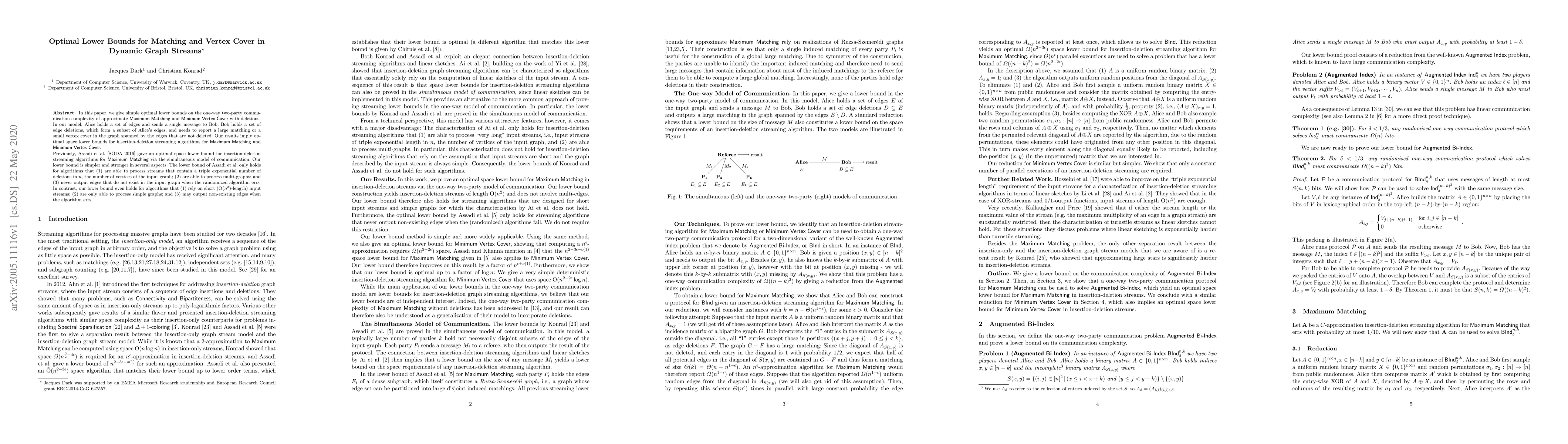 This paper establishes simple and optimal lower bounds on the communication complexity for approximate Maximum Matching and Minimum Vertex Cover in dynamic graph streams, showing stronger results than previous work by Assadi et al. The new bounds apply even to short streams and simple graphs, with allowance for non-existing edges in erroneous outputs.