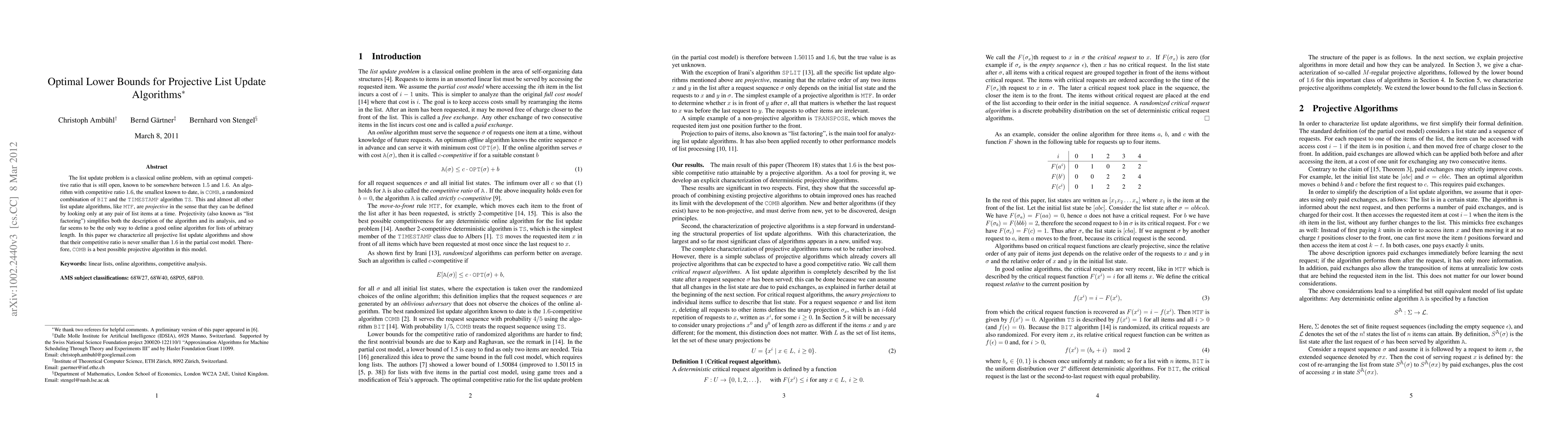The list update problem is a classical online problem, with an optimal competitive ratio that is still open, known to be somewhere between 1.5 and 1.6. An algorithm with competitive ratio 1.6, the smallest known to date, is COMB, a randomized combination of BIT and the TIMESTAMP algorithm TS. This and almost all other list update algorithms, like MTF, are projective in the sense that they can be defined by looking only at any pair of list items at a time. Projectivity (also known as "list factoring") simplifies both the description of the algorithm and its analysis, and so far seems to be the only way to define a good online algorithm for lists of arbitrary length. In this paper we characterize all projective list update algorithms and show that their competitive ratio is never smaller than 1.6 in the partial cost model. Therefore, COMB is a best possible projective algorithm in this model.