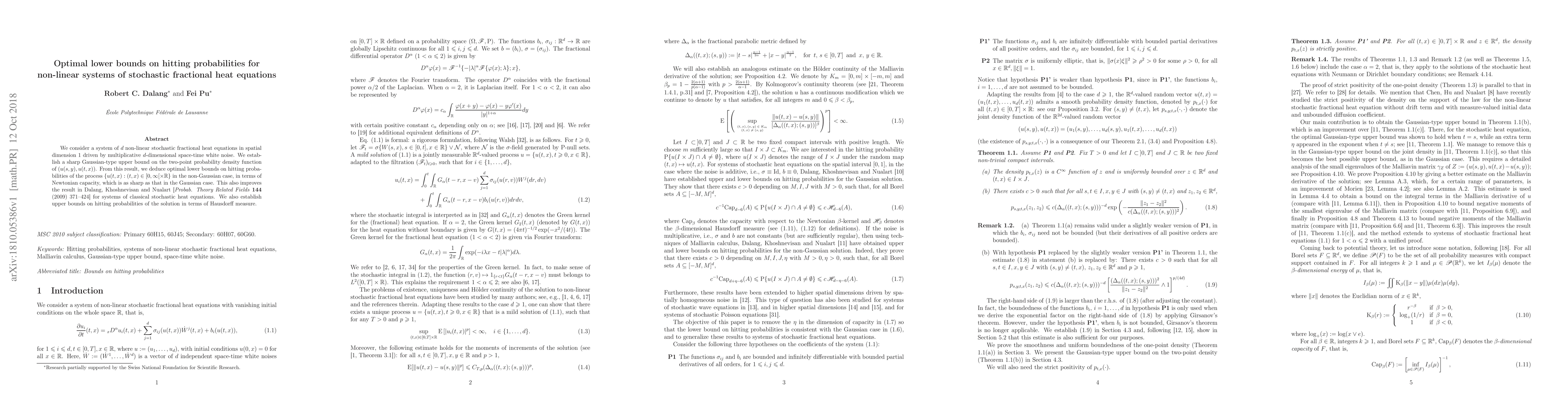 We consider a system of $d$ non-linear stochastic fractional heat equations in spatial dimension $1$ driven by multiplicative $d$-dimensional space-time white noise. We establish a sharp Gaussian-type upper bound on the two-point probability density function of $(u(s, y), u (t, x))$. From this result, we deduce optimal lower bounds on hitting probabilities of the process $\{u(t, x): (t, x) \in [0, \infty[ \times \mathbb{R}\}$ in the non-Gaussian case, in terms of Newtonian capacity, which is as sharp as that in the Gaussian case. This also improves the result in Dalang, Khoshnevisan and Nualart [\textit{Probab. Theory Related Fields} \textbf{144} (2009) 371--424] for systems of classical stochastic heat equations. We also establish upper bounds on hitting probabilities of the solution in terms of Hausdorff measure.