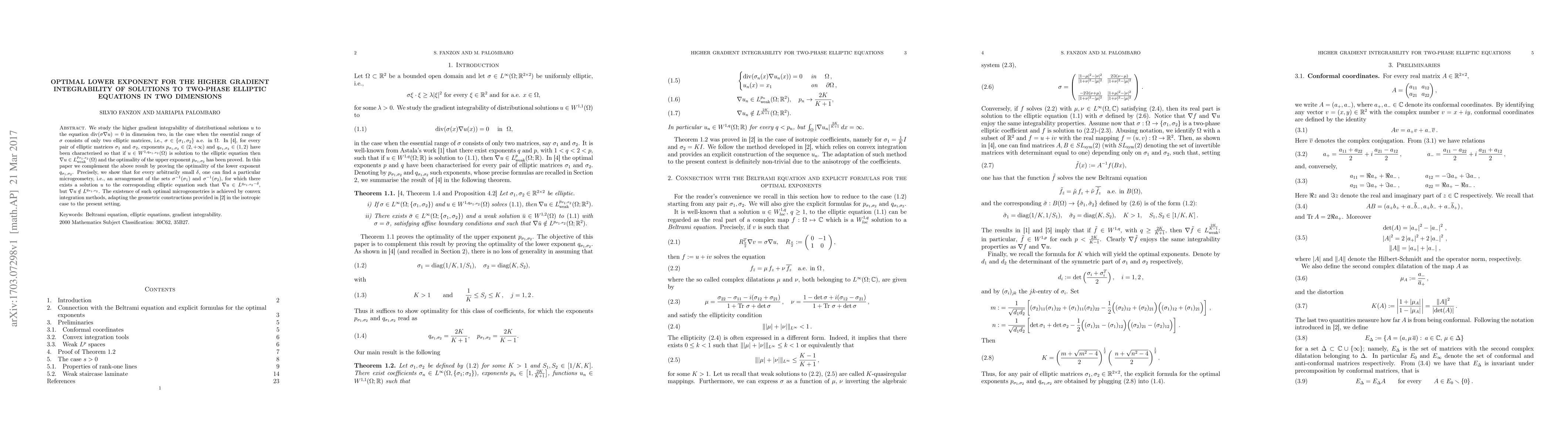 This paper investigates the optimal lower exponent for the higher gradient integrability of solutions to two-phase elliptic equations in two dimensions. It proves the optimality of the lower exponent $q_{\sigma_1,\sigma_2}$, demonstrating that no smaller exponent can achieve the same integrability for the gradient of solutions.