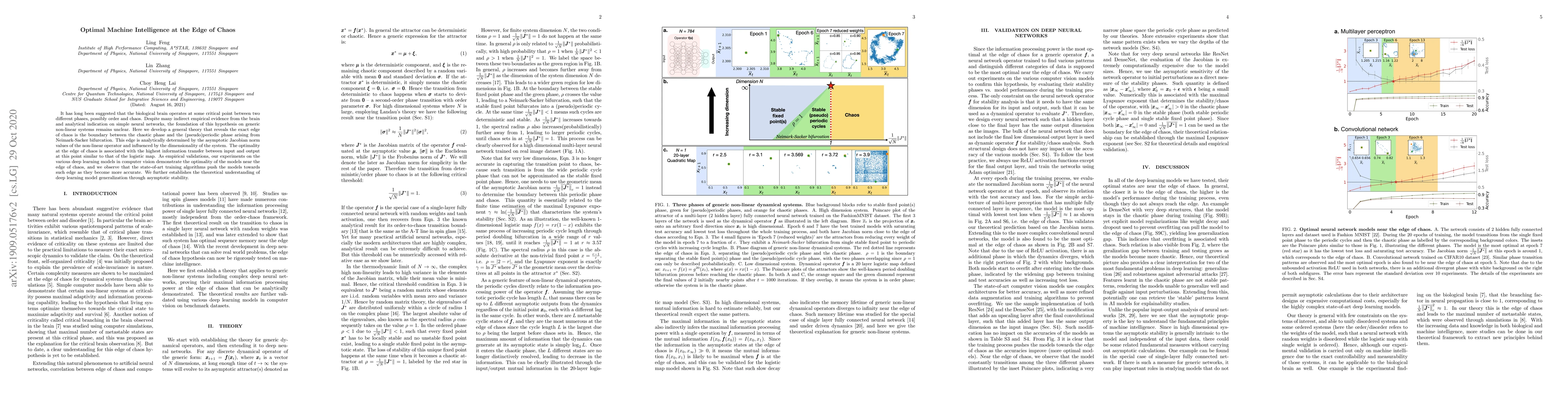 It has long been suggested that the biological brain operates at some critical point between two different phases, possibly order and chaos. Despite many indirect empirical evidence from the brain and analytical indication on simple neural networks, the foundation of this hypothesis on generic non-linear systems remains unclear. Here we develop a general theory that reveals the exact edge of chaos is the boundary between the chaotic phase and the (pseudo)periodic phase arising from Neimark-Sacker bifurcation. This edge is analytically determined by the asymptotic Jacobian norm values of the non-linear operator and influenced by the dimensionality of the system. The optimality at the edge of chaos is associated with the highest information transfer between input and output at this point similar to that of the logistic map. As empirical validations, our experiments on the various deep learning models in computer vision demonstrate the optimality of the models near the edge of chaos, and we observe that the state-of-art training algorithms push the models towards such edge as they become more accurate. We further establishes the theoretical understanding of deep learning model generalization through asymptotic stability.