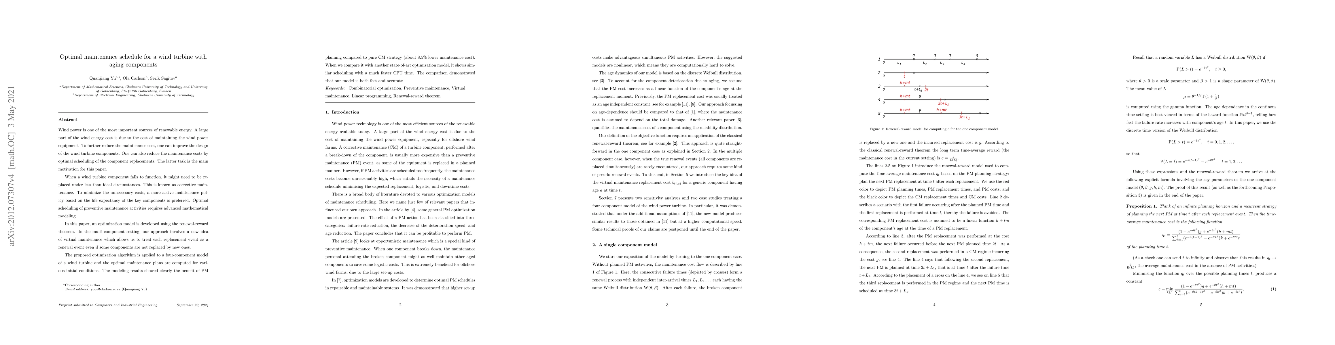 Wind power is one of the most important sources of renewable energy. A large part of the wind energy cost is due to the cost of maintaining the wind power equipment. To further reduce the maintenance cost, one can improve the design of the wind turbine components. One can also reduce the maintenance costs by optimal scheduling of the component replacements. The latter task is the main motivation for this paper. When a wind turbine component fails to function, it might need to be replaced under less than ideal circumstances. This is known as corrective maintenance. To minimize the unnecessary costs, a more active maintenance policy based on the life expectancy of the key components is preferred. Optimal scheduling of preventive maintenance activities requires advanced mathematical modeling. In this paper, an optimization model is developed using the renewal-reward theorem. In the multi-component setting, our approach involves a new idea of virtual maintenance which allows us to treat each replacement event as a renewal event even if some components are not replaced by new ones. The proposed optimization algorithm is applied to a four-component model of a wind turbine and the optimal maintenance plans are computed for various initial conditions. The modeling results showed clearly the benefit of PM planning compared to pure CM strategy (about 8.5% lower maintenance cost). When we compare it with another state-of-art optimization model, it shows similar scheduling with a much faster CPU time. The comparison demonstrated that our model is both fast and accurate.
