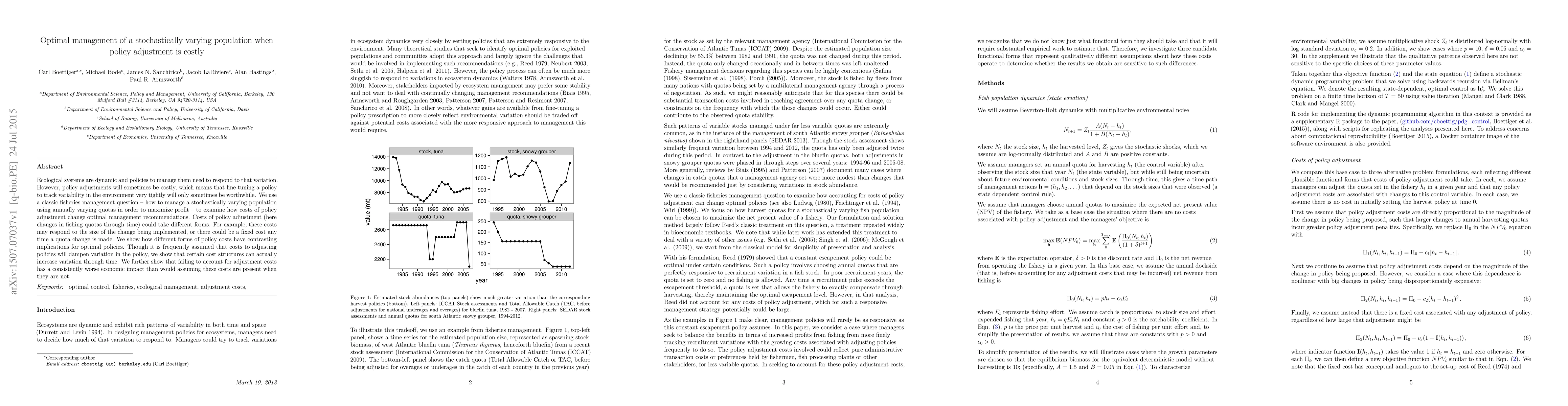 Ecological systems are dynamic and policies to manage them need to respond to that variation. However, policy adjustments will sometimes be costly, which means that fine-tuning a policy to track variability in the environment very tightly will only sometimes be worthwhile. We use a classic fisheries management question -- how to manage a stochastically varying population using annually varying quotas in order to maximize profit -- to examine how costs of policy adjustment change optimal management recommendations. Costs of policy adjustment (here changes in fishing quotas through time) could take different forms. For example, these costs may respond to the size of the change being implemented, or there could be a fixed cost any time a quota change is made. We show how different forms of policy costs have contrasting implications for optimal policies. Though it is frequently assumed that costs to adjusting policies will dampen variation in the policy, we show that certain cost structures can actually increase variation through time. We further show that failing to account for adjustment costs has a consistently worse economic impact than would assuming these costs are present when they are not.