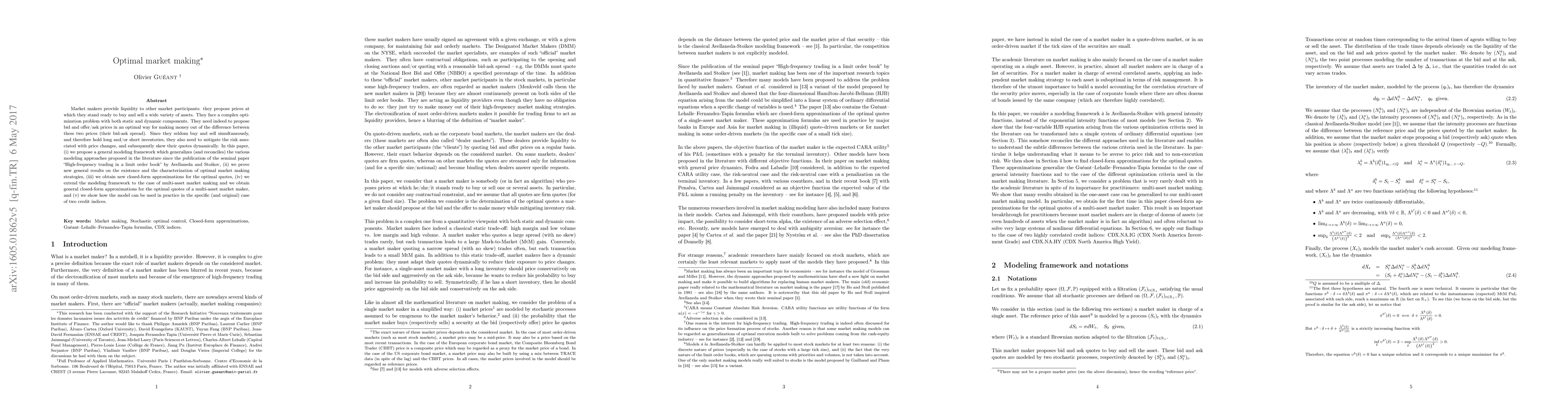 Market makers provide liquidity to other market participants: they propose prices at which they stand ready to buy and sell a wide variety of assets. They face a complex optimization problem with both static and dynamic components. They need indeed to propose bid and offer/ask prices in an optimal way for making money out of the difference between these two prices (their bid-ask spread). Since they seldom buy and sell simultaneously, and therefore hold long and/or short inventories, they also need to mitigate the risk associated with price changes, and subsequently skew their quotes dynamically. In this paper, (i) we propose a general modeling framework which generalizes (and reconciles) the various modeling approaches proposed in the literature since the publication of the seminal paper "High-frequency trading in a limit order book" by Avellaneda and Stoikov, (ii) we prove new general results on the existence and the characterization of optimal market making strategies, (iii) we obtain new closed-form approximations for the optimal quotes, (iv) we extend the modeling framework to the case of multi-asset market making and we obtain general closed-form approximations for the optimal quotes of a multi-asset market maker, and (v) we show how the model can be used in practice in the specific (and original) case of two credit indices.