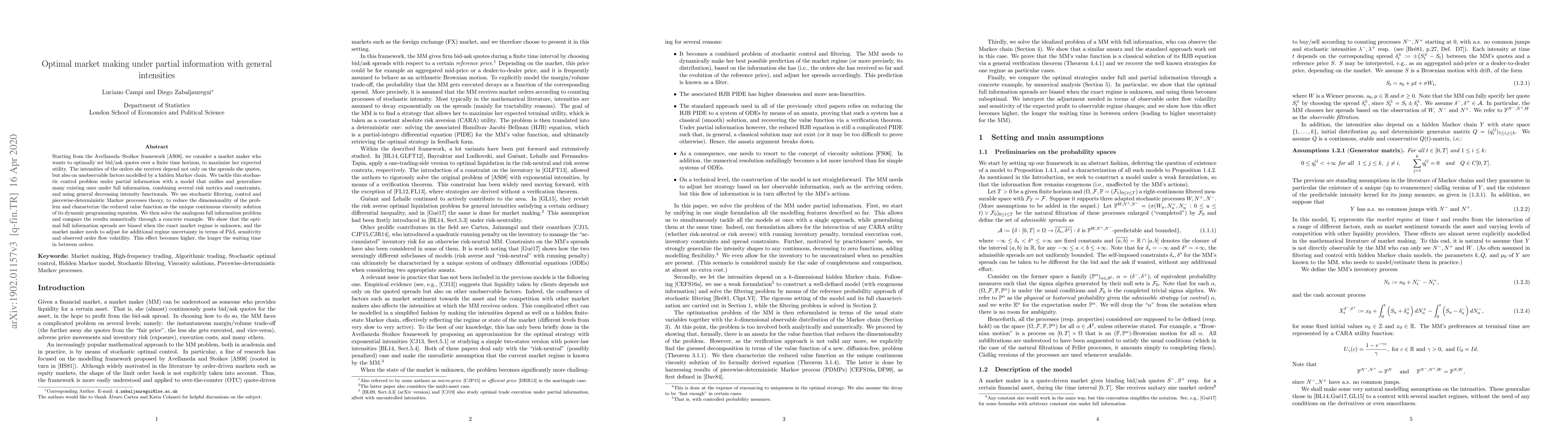 Starting from the Avellaneda-Stoikov framework, we consider a market maker who wants to optimally set bid/ask quotes over a finite time horizon, to maximize her expected utility. The intensities of the orders she receives depend not only on the spreads she quotes, but also on unobservable factors modelled by a hidden Markov chain. We tackle this stochastic control problem under partial information with a model that unifies and generalizes many existing ones under full information, combining several risk metrics and constraints, and using general decreasing intensity functionals. We use stochastic filtering, control and piecewise-deterministic Markov processes theory, to reduce the dimensionality of the problem and characterize the reduced value function as the unique continuous viscosity solution of its dynamic programming equation. We then solve the analogous full information problem and compare the results numerically through a concrete example. We show that the optimal full information spreads are biased when the exact market regime is unknown, and the market maker needs to adjust for additional regime uncertainty in terms of P&L sensitivity and observed order flow volatility. This effect becomes higher, the longer the waiting time in between orders.