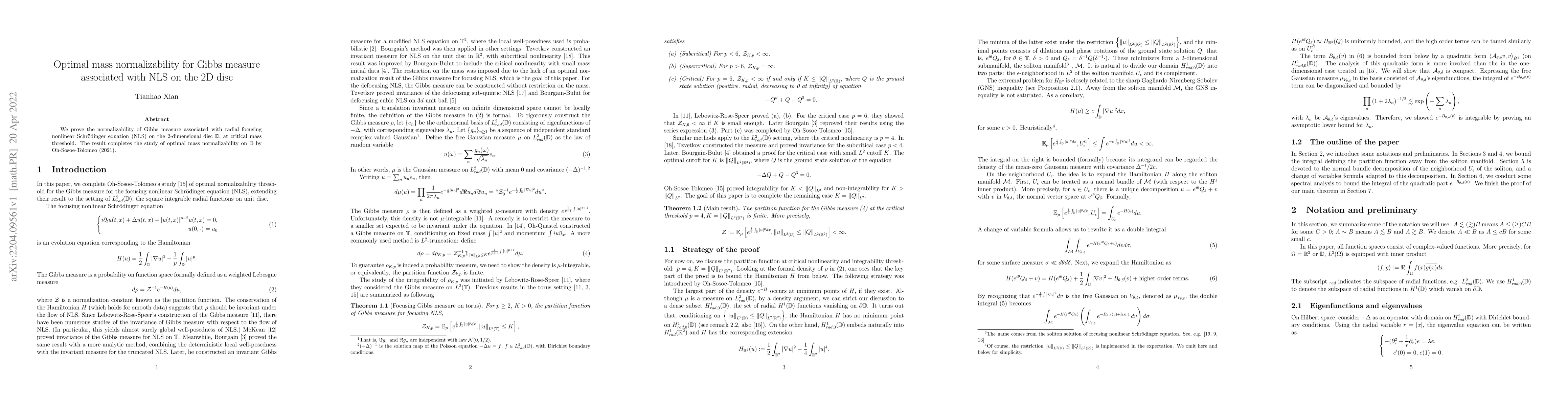 We prove the normalizability of Gibbs measure associated with radial focusing nonlinear Schr\"{o}dinger equation (NLS) on the 2-dimensional disc $\mathbb{D}$, at critical mass threshold. The result completes the study of optimal mass normalizability on $\mathbb{D}$ by Oh-Sosoe-Tolomeo (2021).