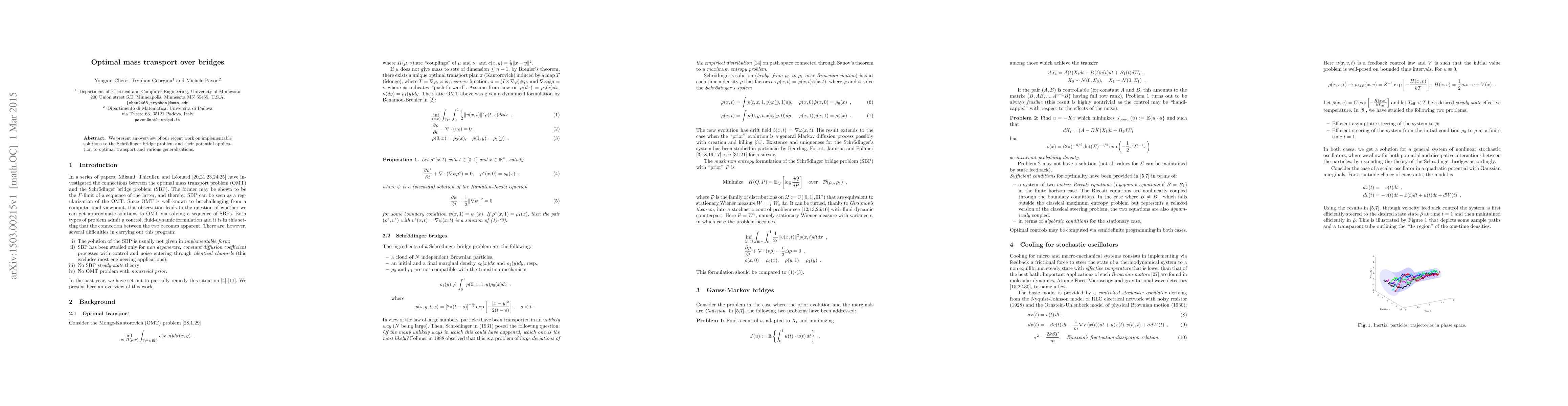 We present an overview of our recent work on implementable solutions to the Schroedinger bridge problem and their potential application to optimal transport and various generalizations.