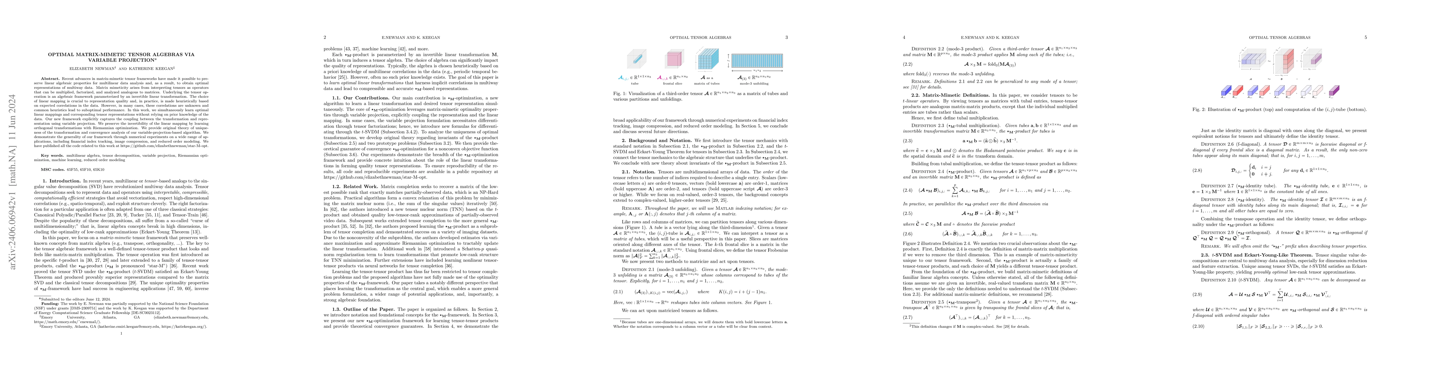 This paper introduces a novel framework for optimal matrix-mimetic tensor algebras using variable projection to learn optimal linear mappings without prior knowledge of data correlations. The method preserves tensor invertibility and demonstrates successful applications in financial index tracking, image compression, and reduced order modeling.