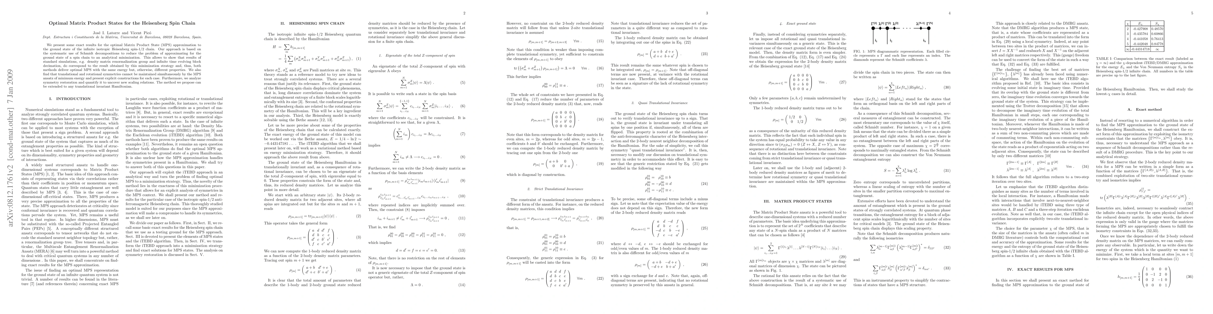 We present some exact results for the optimal Matrix Product State (MPS) approximation to the ground state of the infinite isotropic Heisenberg spin-1/2 chain. Our approach is based on the systematic use of Schmidt decompositions to reduce the problem of approximating for the ground state of a spin chain to an analytical minimization. This allows to show that results of standard simulations, e.g. density matrix renormalization group and infinite time evolving block decimation, do correspond to the result obtained by this minimization strategy and, thus, both methods deliver optimal MPS with the same energy but, otherwise, different properties. We also find that translational and rotational symmetries cannot be maintained simultaneously by the MPS ansatz of minimum energy and present explicit constructions for each case. Furthermore, we analyze symmetry restoration and quantify it to uncover new scaling relations. The method we propose can be extended to any translational invariant Hamiltonian.
