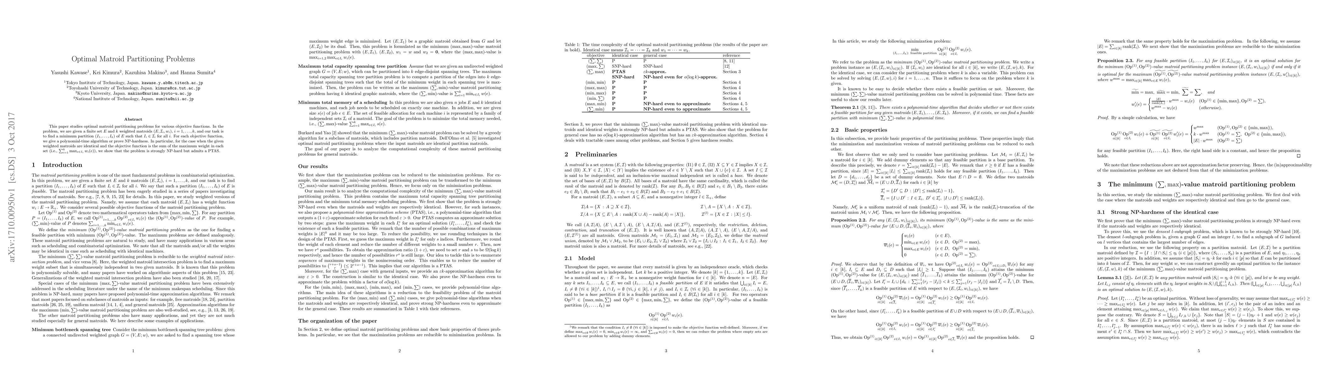 This paper explores optimal matroid partitioning problems for various objective functions, providing polynomial-time algorithms or NP-hardness proofs. It specifically shows that partitioning identical weighted matroids to minimize the sum of maximum weights is strongly NP-hard but can be approximated within any factor.
