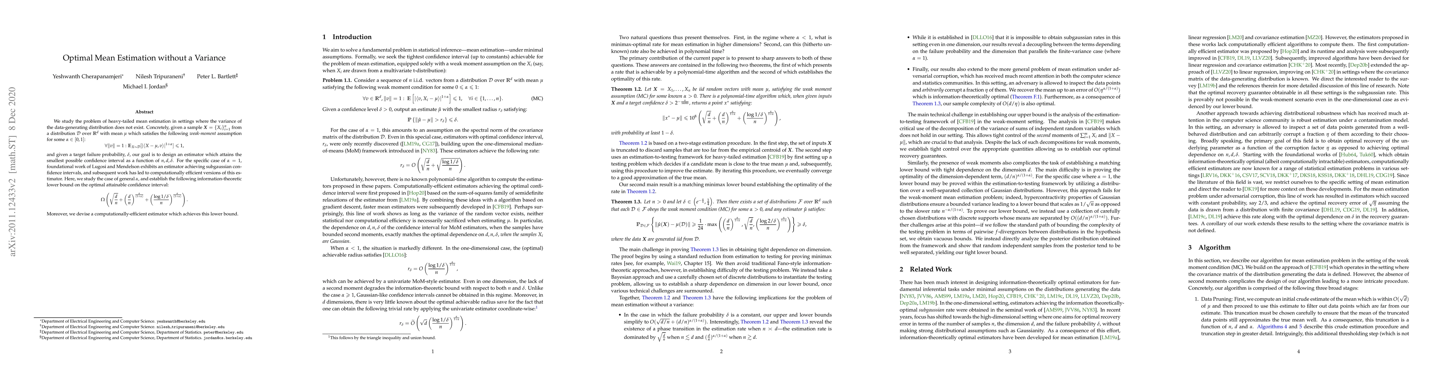 We study the problem of heavy-tailed mean estimation in settings where the variance of the data-generating distribution does not exist. Concretely, given a sample $\mathbf{X} = \{X_i\}_{i = 1}^n$ from a distribution $\mathcal{D}$ over $\mathbb{R}^d$ with mean $\mu$ which satisfies the following \emph{weak-moment} assumption for some ${\alpha \in [0, 1]}$: \begin{equation*} \forall \|v\| = 1: \mathbb{E}_{X \thicksim \mathcal{D}}[\lvert \langle X - \mu, v\rangle \rvert^{1 + \alpha}] \leq 1, \end{equation*} and given a target failure probability, $\delta$, our goal is to design an estimator which attains the smallest possible confidence interval as a function of $n,d,\delta$. For the specific case of $\alpha = 1$, foundational work of Lugosi and Mendelson exhibits an estimator achieving subgaussian confidence intervals, and subsequent work has led to computationally efficient versions of this estimator. Here, we study the case of general $\alpha$, and establish the following information-theoretic lower bound on the optimal attainable confidence interval: \begin{equation*} \Omega \left(\sqrt{\frac{d}{n}} + \left(\frac{d}{n}\right)^{\frac{\alpha}{(1 + \alpha)}} + \left(\frac{\log 1 / \delta}{n}\right)^{\frac{\alpha}{(1 + \alpha)}}\right). \end{equation*} Moreover, we devise a computationally-efficient estimator which achieves this lower bound.