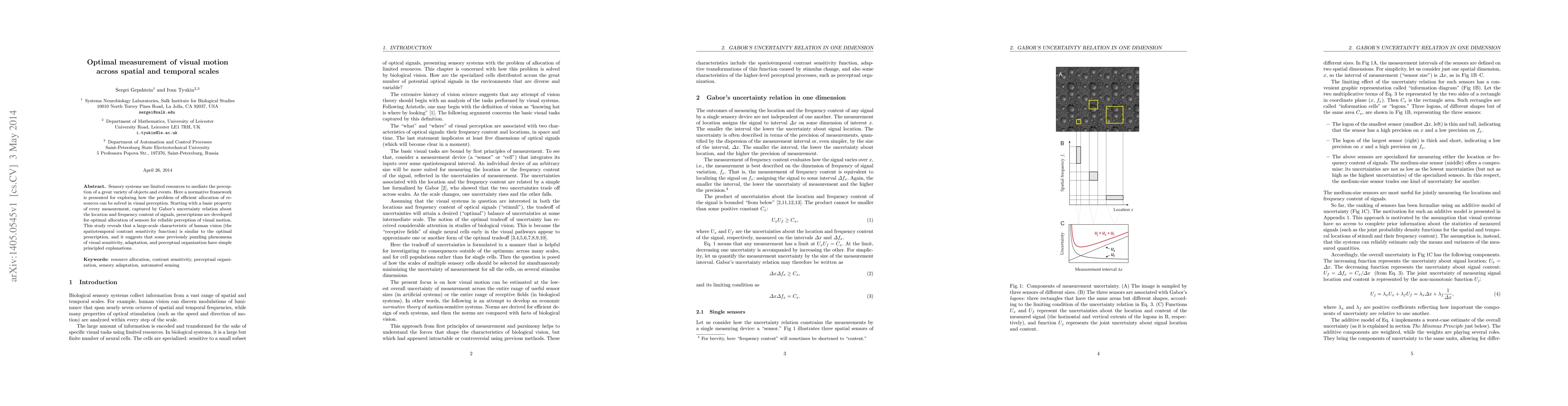Sensory systems use limited resources to mediate the perception of a great variety of objects and events. Here a normative framework is presented for exploring how the problem of efficient allocation of resources can be solved in visual perception. Starting with a basic property of every measurement, captured by Gabor's uncertainty relation about the location and frequency content of signals, prescriptions are developed for optimal allocation of sensors for reliable perception of visual motion. This study reveals that a large-scale characteristic of human vision (the spatiotemporal contrast sensitivity function) is similar to the optimal prescription, and it suggests that some previously puzzling phenomena of visual sensitivity, adaptation, and perceptual organization have simple principled explanations.