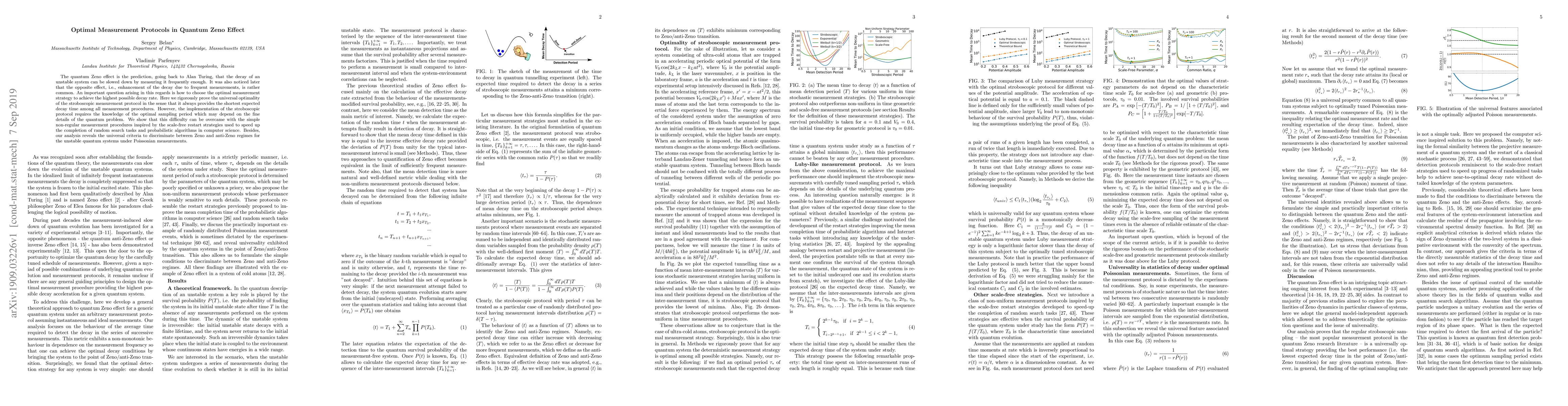 The quantum Zeno effect is the prediction, going back to Alan Turing, that the decay of an unstable system can be slowed down by measuring it frequently enough. It was also noticed later that the opposite effect, i.e., enhancement of the decay due to frequent measurements, is rather common. An important question arising in this regards is how to choose the optimal measurement strategy to achieve the highest possible decay rate. Here we rigorously prove the universal optimality of the stroboscopic measurement protocol in the sense that it always provides the shortest expected decay time among all measurement procedures. However, the implementation of the stroboscopic protocol requires the knowledge of the optimal sampling period which may depend on the fine details of the quantum problem. We show that this difficulty can be overcame with the simple non-regular measurement procedures inspired by the scale-free restart strategies used to speed up the completion of random search tasks and probabilistic algorithms in computer science. Besides, our analysis reveals the universal criteria to discriminate between Zeno and anti-Zeno regimes for the unstable quantum systems under Poissonian measurements.