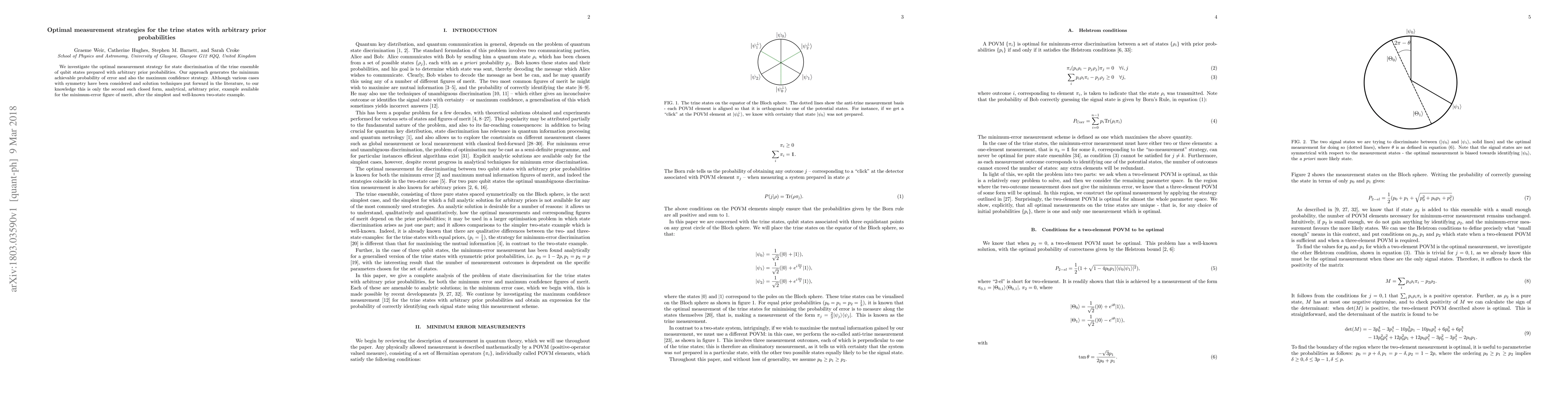 We investigate the optimal measurement strategy for state discrimination of the trine ensemble of qubit states prepared with arbitrary prior probabilities. Our approach generates the minimum achievable probability of error and also the maximum confidence strategy. Although various cases with symmetry have been considered and solution techniques put forward in the literature, to our knowledge this is only the second such closed form, analytical, arbitrary prior, example available for the minimum-error figure of merit, after the simplest and well-known two-state example.