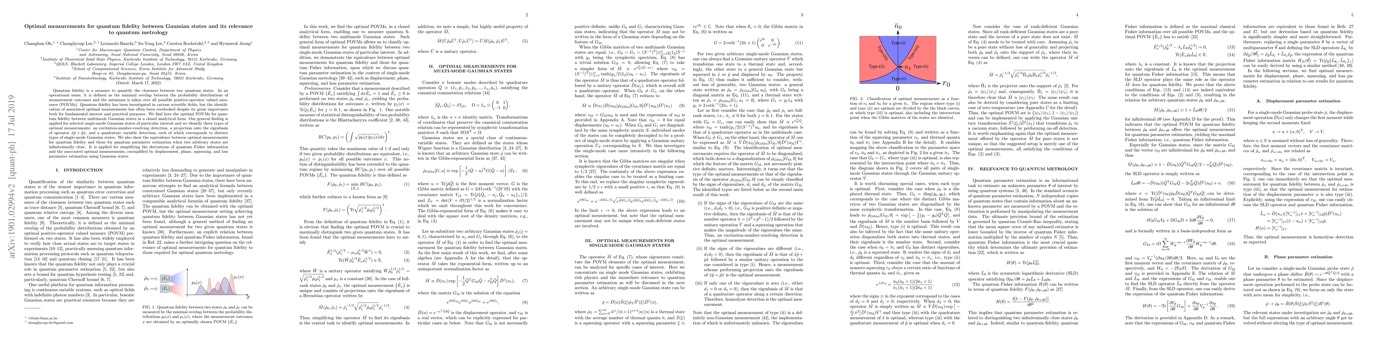This paper identifies optimal positive-operator valued measures (POVMs) for quantum fidelity between multi-mode Gaussian states, revealing three types of optimal measurements: number-resolving detection, eigenbasis projection, and quadrature detection. It also demonstrates the equivalence between optimal fidelity measurements and parameter estimation, facilitating the determination of optimal measurements for various quantum parameters.