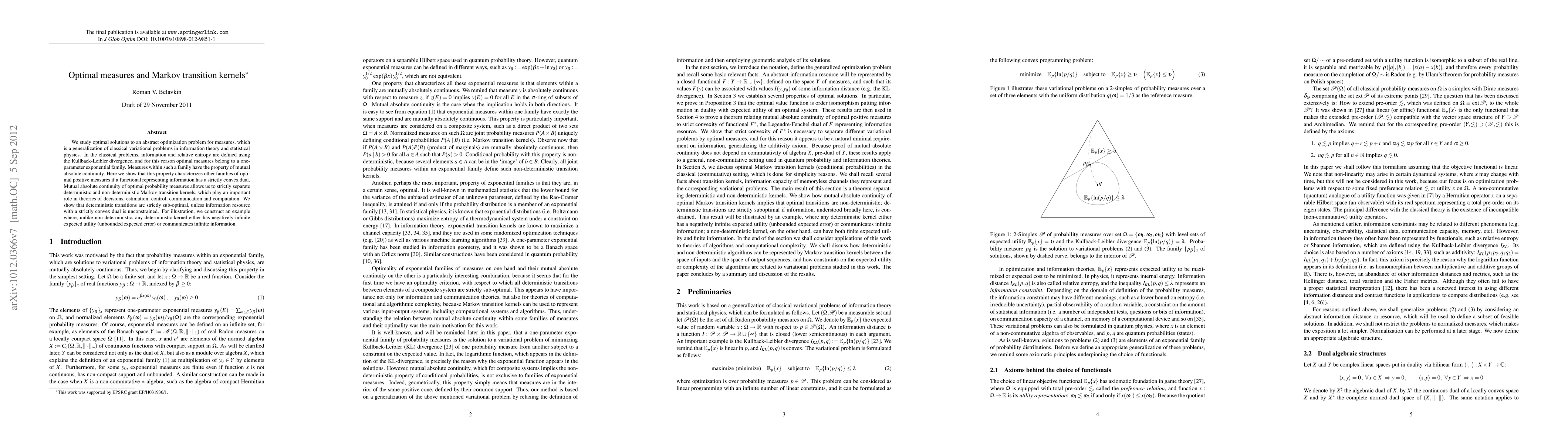 Researchers show that optimal probability measures in information theory are mutually absolutely continuous, which allows for strict separation between deterministic and non-deterministic Markov transition kernels.