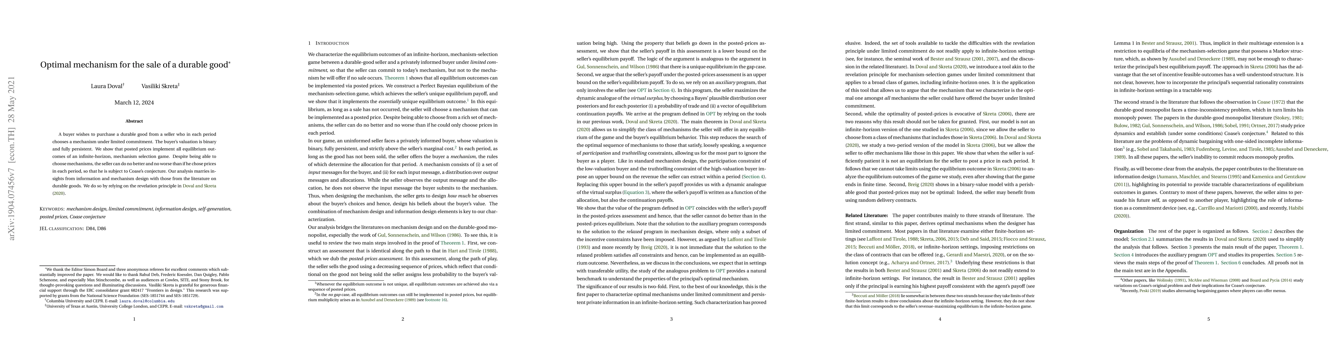 A buyer wishes to purchase a durable good from a seller who in each period chooses a mechanism under limited commitment. The buyer's valuation is binary and fully persistent. We show that posted prices implement all equilibrium outcomes of an infinite-horizon, mechanism selection game. Despite being able to choose mechanisms, the seller can do no better and no worse than if he chose prices in each period, so that he is subject to Coase's conjecture. Our analysis marries insights from information and mechanism design with those from the literature on durable goods. We do so by relying on the revelation principle in Doval and Skreta (2020).