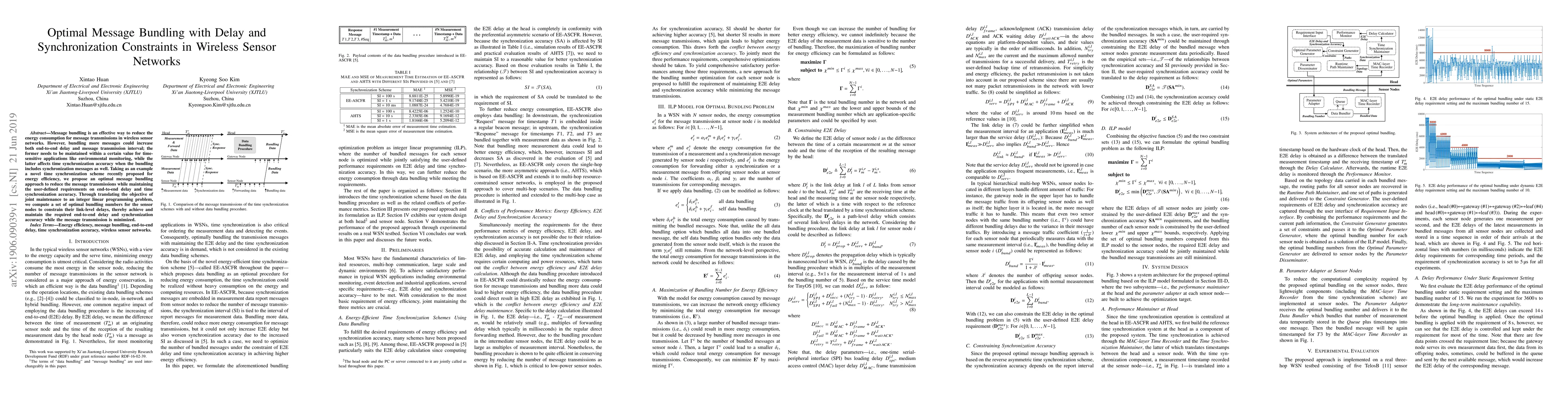 Message bundling is an effective way to reduce the energy consumption for message transmissions in wireless sensor networks. However, bundling more messages could increase both end-to-end delay and message transmission interval; the former needs to be maintained within a certain value for time-sensitive applications like environmental monitoring, while the latter affects time synchronization accuracy when the bundling includes synchronization messages as well. Taking as an example a novel time synchronization scheme recently proposed for energy efficiency, we propose an optimal message bundling approach to reduce the message transmissions while maintaining the user-defined requirements on end-to-end delay and time synchronization accuracy. Through translating the objective of joint maintenance to an integer linear programming problem, we compute a set of optimal bundling numbers for the sensor nodes to constrain their link-level delays, thereby achieve and maintain the required end-to-end delay and synchronization accuracy while the message transmission is minimized.