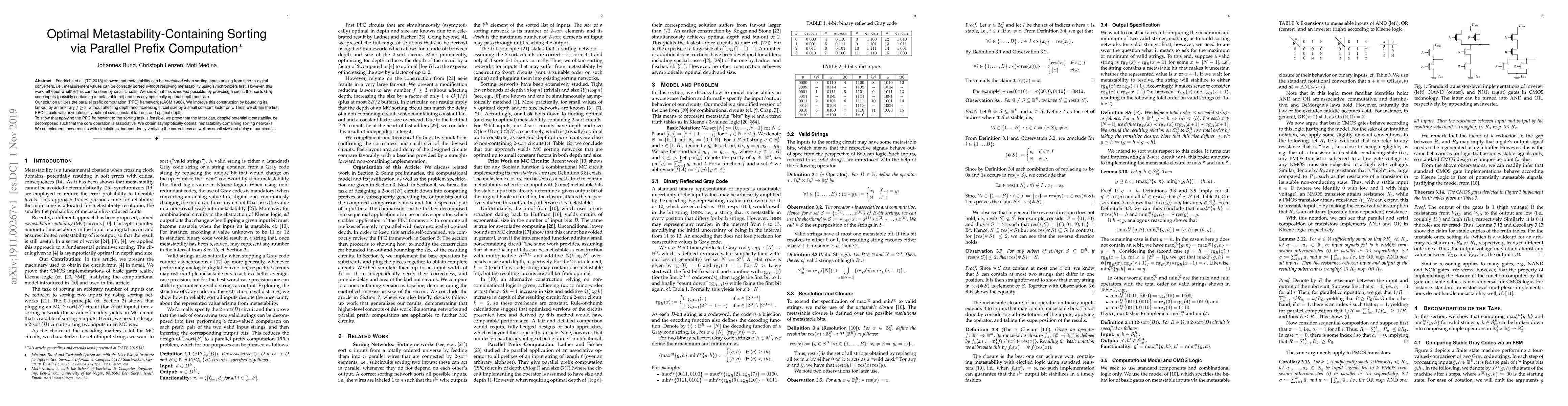 Researchers developed a small circuit that can sort inputs containing metastability using parallel prefix computation, achieving asymptotically optimal depth and size while improving fan-out bounds.