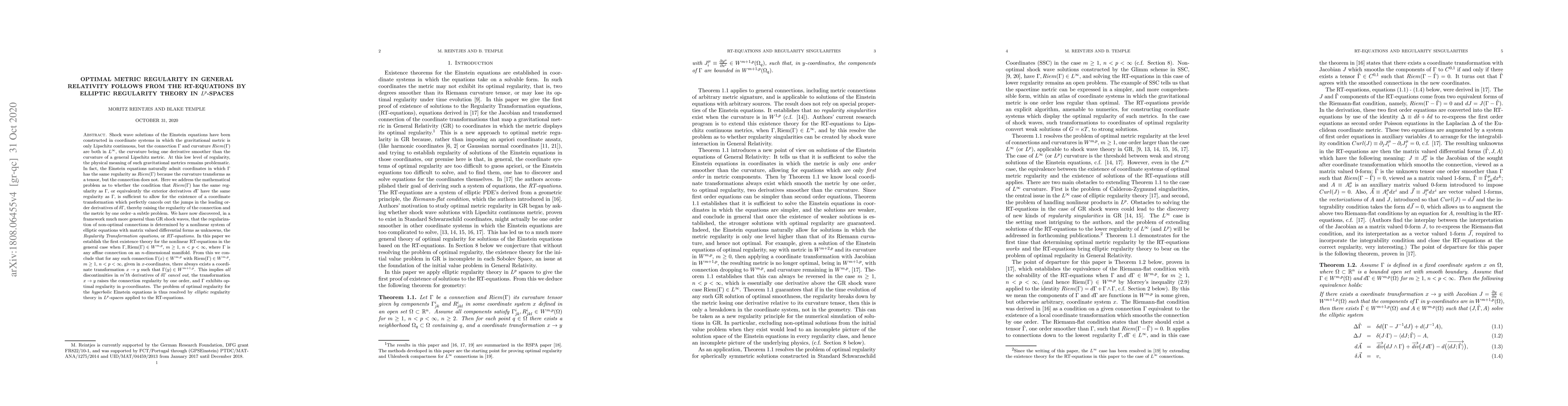 Shock wave solutions of the Einstein equations have been constructed in coordinate systems in which the gravitational metric is only Lipschitz continuous, but the connection $\Gamma$ and curvature $Riem(\Gamma)$ are both in $L^{\infty}$. At this low level of regularity, the physical meaning of such gravitational metrics remains problematic. Here we address the mathematical problem as to whether the condition that $Riem(\Gamma)$ has the same regularity as $\Gamma$, is sufficient for the existence of a coordinate transformation which perfectly cancels out the jumps in the leading order derivatives of $\delta\Gamma$, thereby raising the regularity of the connection and the metric by one order--a subtle problem. We have now discovered, in a framework much more general than GR shock waves, that the regularization of non-optimal connections is determined by a nonlinear system of elliptic equations with matrix valued differential forms as unknowns, the Regularity Transformation equations, or RT-equations. In this paper we establish the first existence theory for the nonlinear RT-equations in the general case when $\Gamma, {\rm Riem}(\Gamma)\in W^{m,p}$, $m\geq1$, $n
