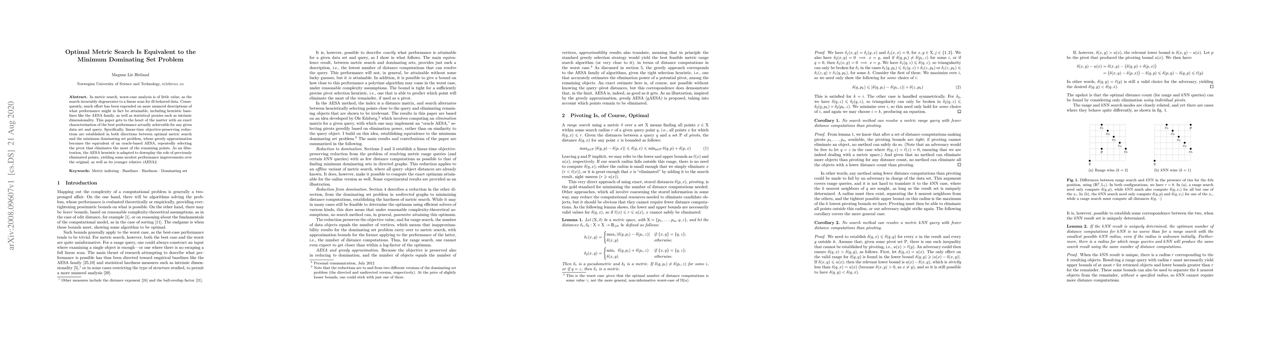 This paper presents a novel equivalence between optimal metric search and the minimum dominating set problem, demonstrating linear-time objective-preserving reductions in both directions. It also improves the AESA heuristic by adapting it to downplay the significance of previously eliminated points, resulting in modest performance enhancements over the original and its relative iAESA2.