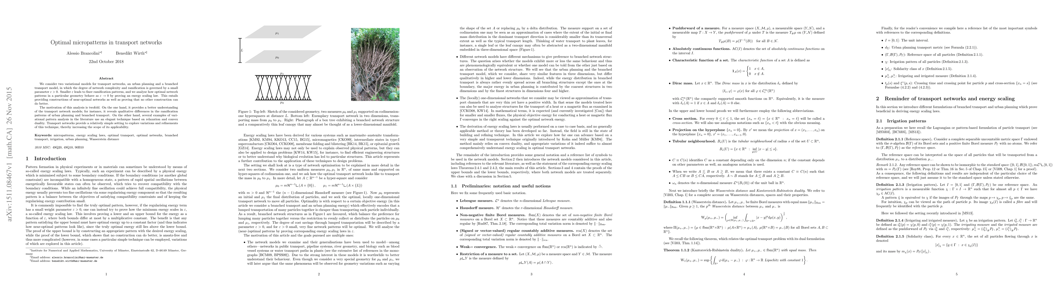 This paper analyzes two variational models for transport networks, focusing on how optimal network patterns evolve as complexity increases. It proves an energy scaling law and constructs near-optimal networks, demonstrating that no other construction can outperform them, thereby enhancing understanding of urban planning and branched transport models.