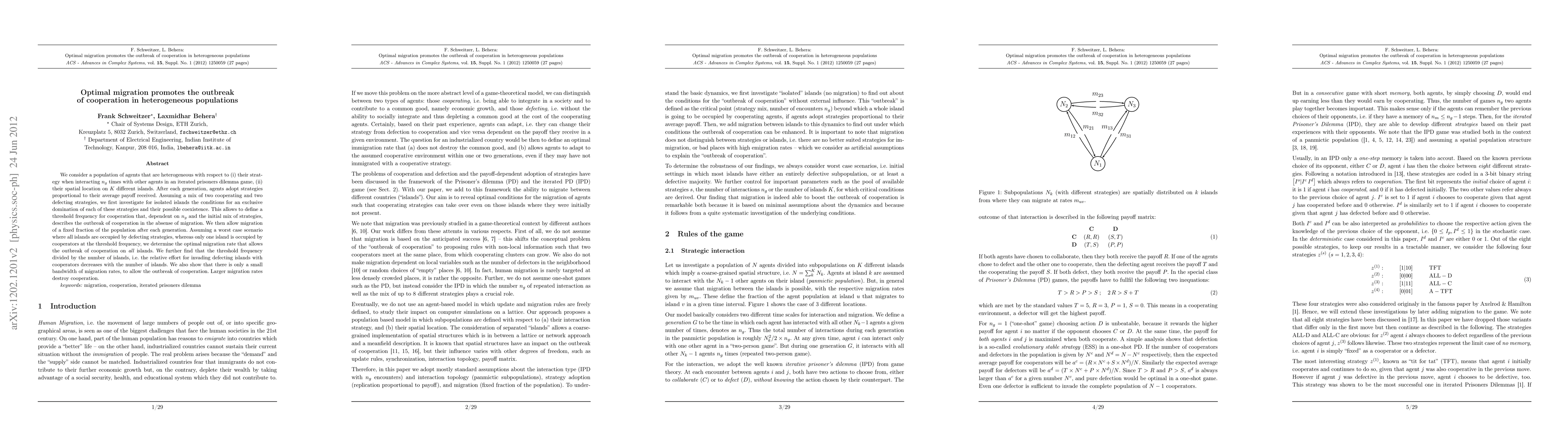 This paper explores how optimal migration among heterogeneous populations can promote cooperation in an iterated prisoners dilemma game. It finds that a specific migration rate can lead to the outbreak of cooperation across multiple islands, while excessive migration undermines cooperation.
