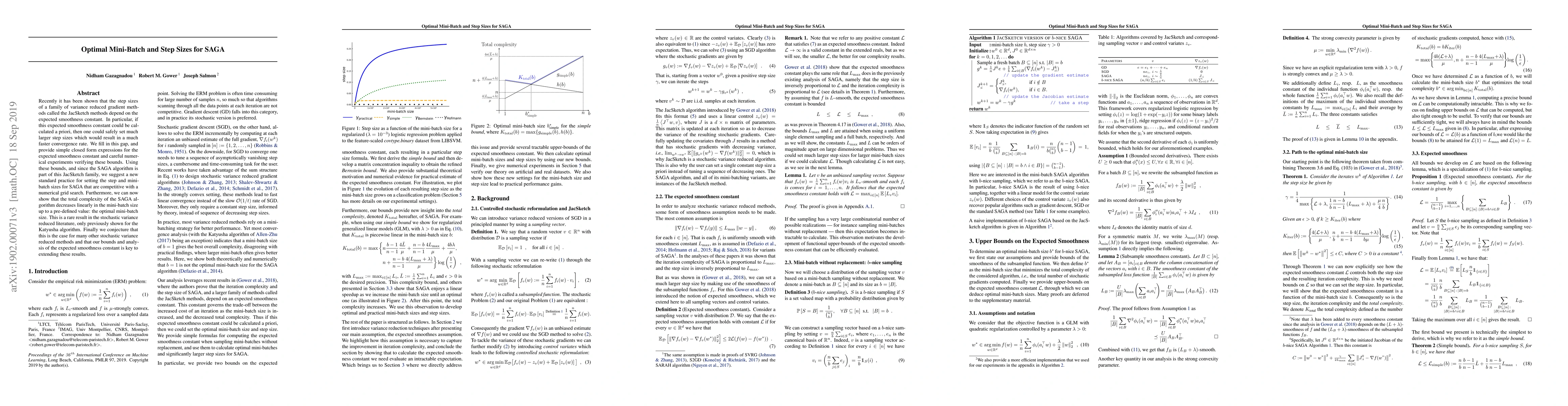 This paper provides closed-form expressions for the expected smoothness constant for JacSketch methods, enabling larger step sizes and faster convergence. It proposes optimal step sizes and mini-batch sizes for SAGA, demonstrating a linear decrease in total complexity with mini-batch size up to an optimal value.