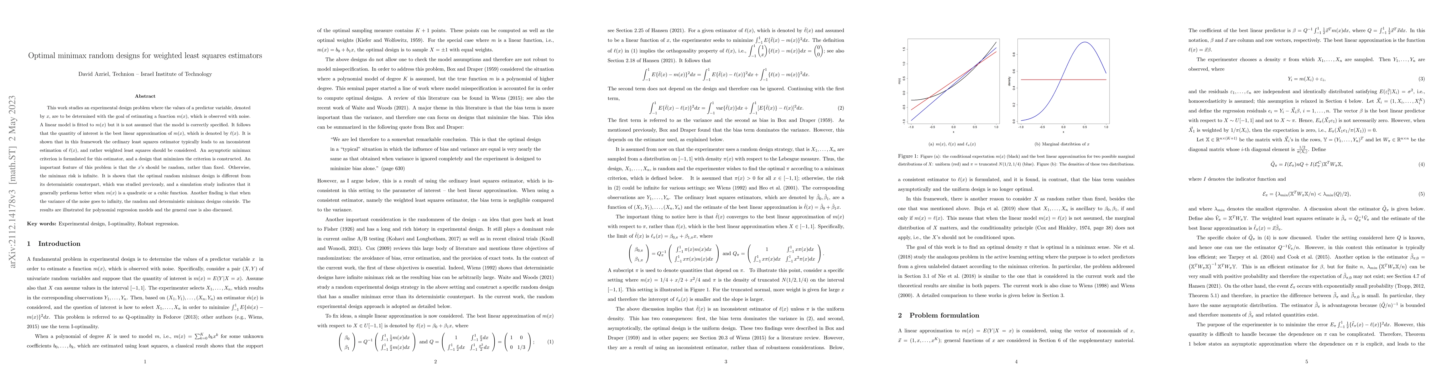 This paper investigates optimal random designs for weighted least squares estimators in experimental settings where the model may be misspecified. It demonstrates that random minimax designs outperform deterministic ones, especially for quadratic or cubic functions, and aligns with deterministic designs when noise variance is high.