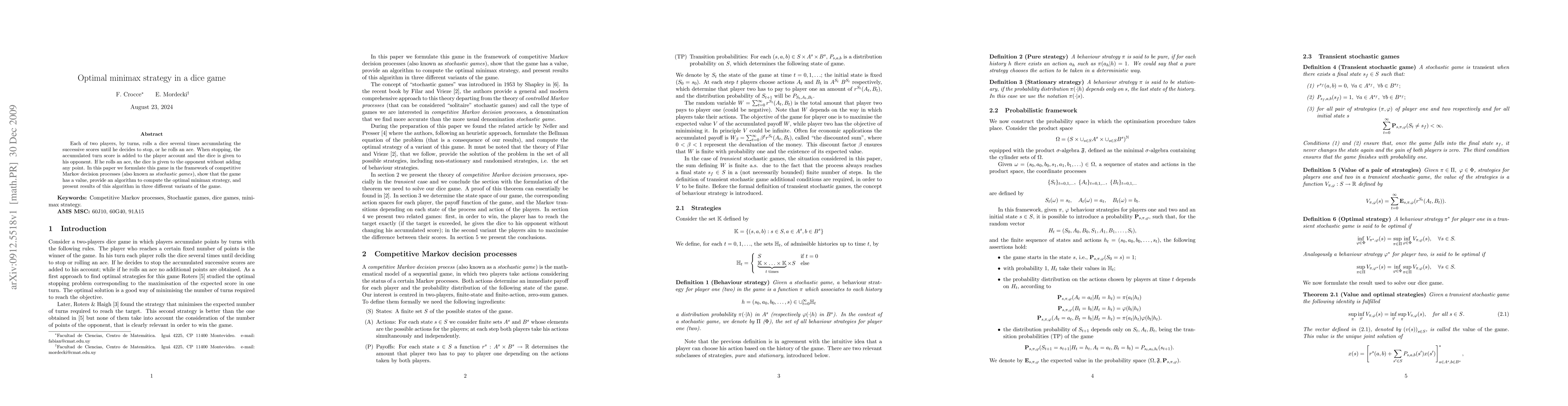 Each of two players, by turns, rolls a dice several times accumulating the successive scores until he decides to stop, or he rolls an ace. When stopping, the accumulated turn score is added to the player account and the dice is given to his opponent. If he rolls an ace, the dice is given to the opponent without adding any point. In this paper we formulate this game in the framework of competitive Markov decision processes (also known as stochastic games), show that the game has a value, provide an algorithm to compute the optimal minimax strategy, and present results of this algorithm in three different variants of the game.