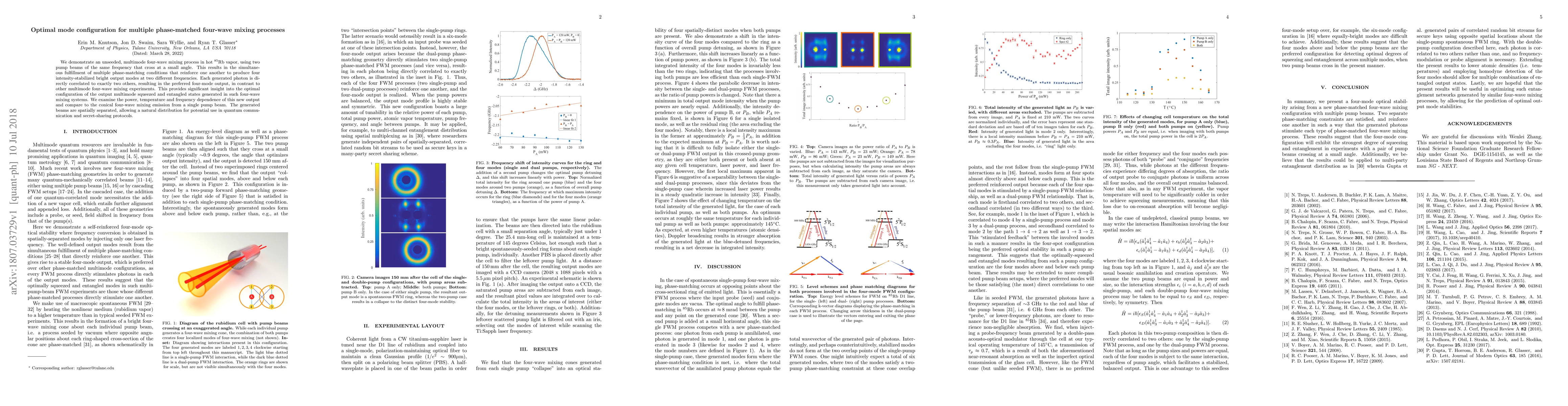 We demonstrate an unseeded, multimode four-wave mixing process in hot $^{85}$Rb vapor, using two pump beams of the same frequency that cross at a small angle. This results in the simultaneous fulfillment of multiple phase-matching conditions that reinforce one another to produce four intensity-stabilized bright output modes at two different frequencies. Each generated photon is directly correlated to exactly two others, resulting in the preferred four-mode output, in contrast to other multimode four-wave mixing experiments. This provides significant insight into the optimal configuration of the output multimode squeezed and entangled states generated in such four-wave mixing systems. We examine the power, temperature and frequency dependence of this new output and compare to the conical four-wave mixing emission from a single pump beam. The generated beams are spatially separated, allowing a natural distribution for potential use in quantum communication and secret-sharing protocols.