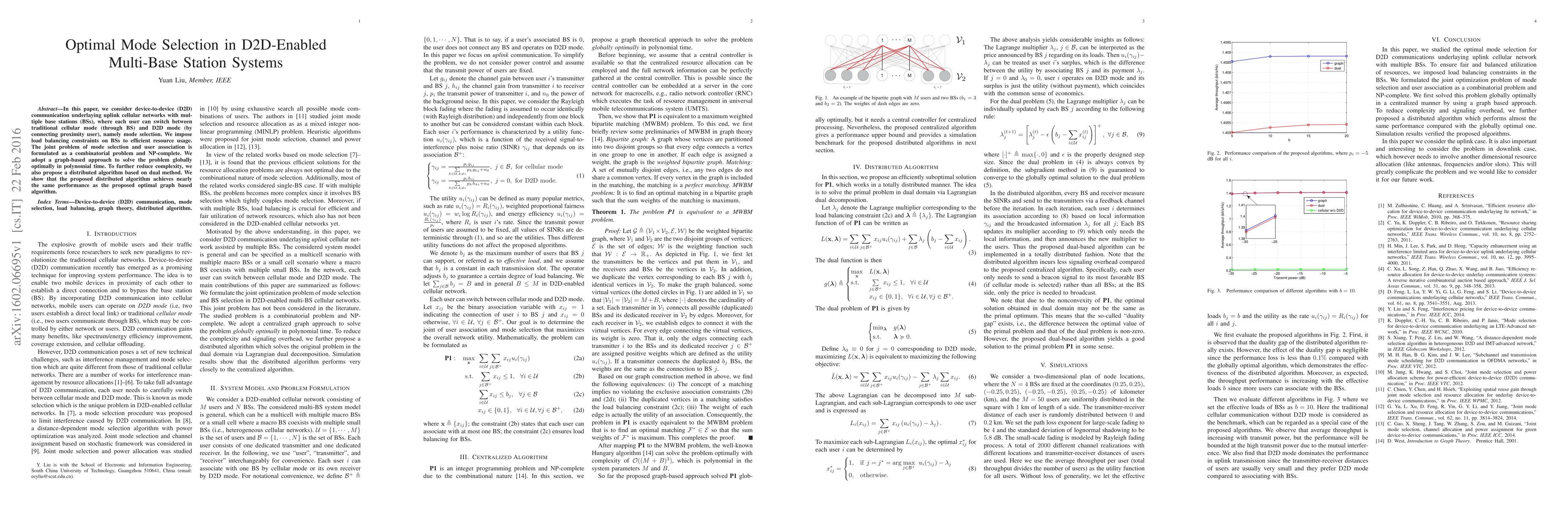This paper addresses the optimal mode selection for device-to-device (D2D) communication in multi-base station cellular networks, formulating it as a combinatorial problem. It proposes a graph-based approach for global optimal solutions and a distributed algorithm based on the dual method, demonstrating comparable performance.
