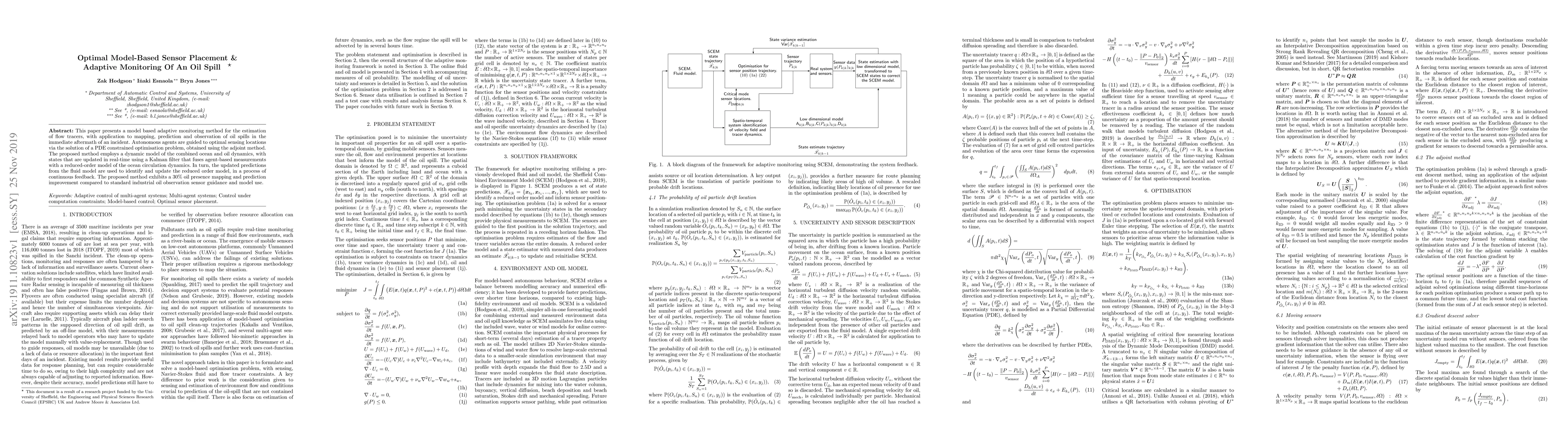 This paper presents a model based adaptive monitoring method for the estimation of flow tracers, with application to mapping, prediction and observation of oil spills in the immediate aftermath of an incident. Autonomous agents are guided to optimal sensing locations via the solution of a PDE constrained optimisation problem, obtained using the adjoint method. The proposed method employs a dynamic model of the combined ocean and oil dynamics, with states that are updated in real-time using a Kalman filter that fuses agent-based measurements with a reduced-order model of the ocean circulation dynamics. In turn, the updated predictions from the fluid model are used to identify and update the reduced order model, in a process of continuous feedback. The proposed method exhibits a 30% oil presence mapping and prediction improvement compared to standard industrial oil observation sensor guidance and model use.