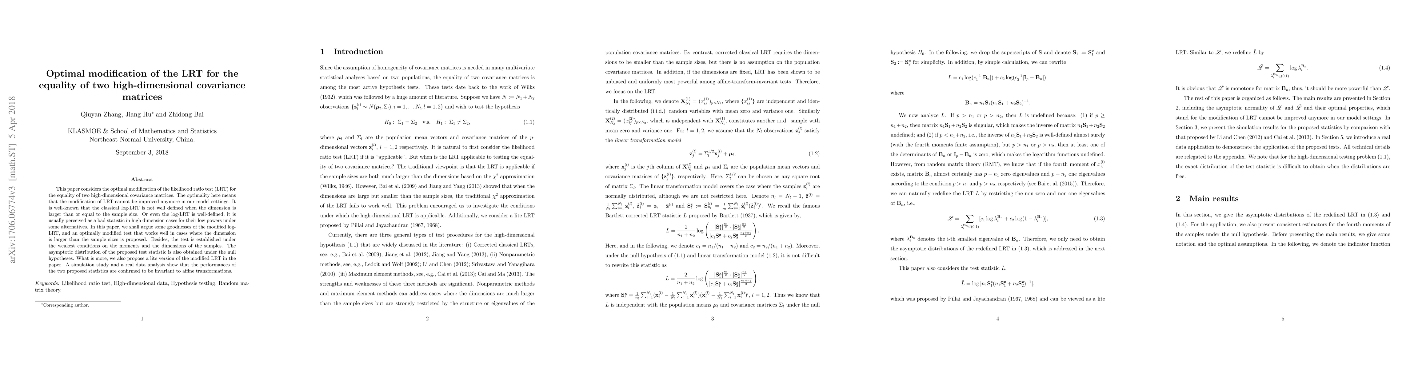 This paper proposes an optimally modified likelihood ratio test for comparing high-dimensional covariance matrices, addressing the issue of the test's inapplicability when dimensions exceed sample sizes. The test is robust under minimal assumptions and performs well in simulations and real data analysis.