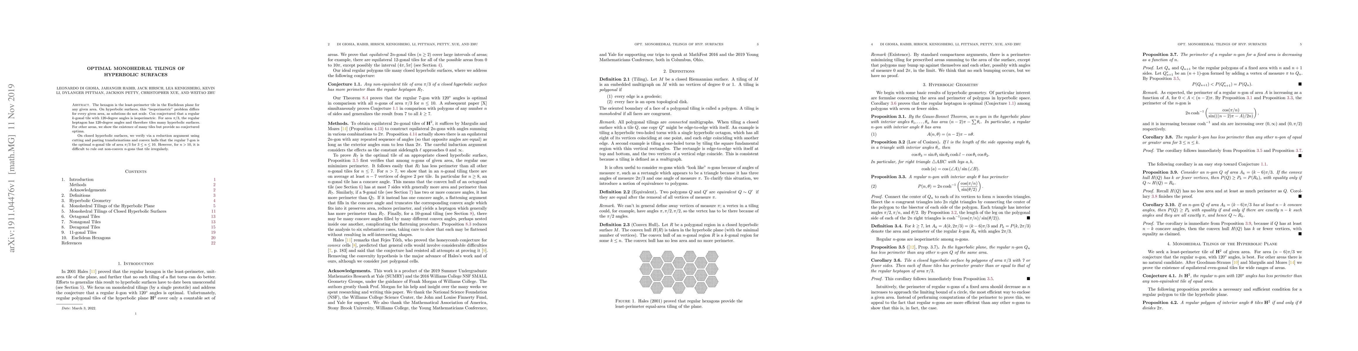 Researchers prove the regular 7-gon is the optimal n-gonal tile for a specific area on hyperbolic surfaces, but find it difficult to rule out non-convex tiles for larger areas.