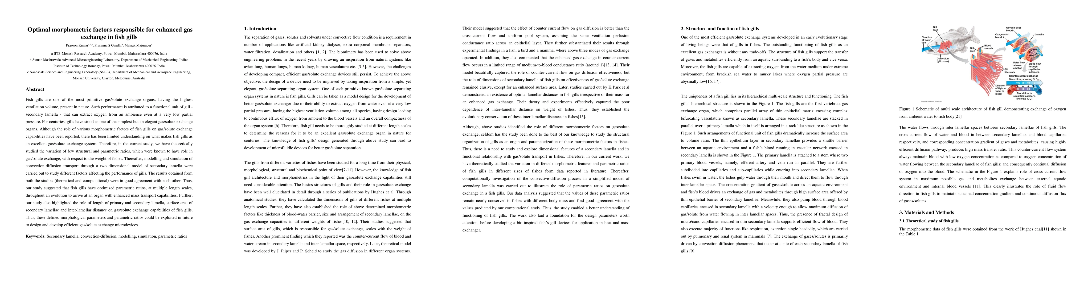 Fish gills are one of the most primitive gas/solute exchange organs, having the highest ventilation volume, present in nature. Such performance is attributed to a functional unit of gill - secondary lamella - that can extract oxygen from an ambience even at a very low partial pressure. For centuries, gills have stood as one of the simplest but an elegant gas/solute exchange organs. Although the role of various morphometric factors of fish gills on gas/solute exchange capabilities have been reported, there has been limited understanding on what makes fish gills as an excellent gas/solute exchange system. Therefore, in the current study, we have theoretically studied the variation of few structural and parametric ratios, which were known to have role in gas/solute exchange, with respect to the weight of fishes. Thereafter, modelling and simulation of convection-diffusion transport through a two dimensional model of secondary lamella were carried out to study different factors affecting the performance of gills. The results obtained from both the studies (theoretical and computational) were in good agreement with each other. Thus, our study suggested that fish gills have optimized parametric ratios, at multiple length scales, throughout an evolution to arrive at an organ with enhanced mass transport capabilities. Further, our study also highlighted the role of length of primary and secondary lamella, surface area of secondary lamellae and inter-lamellar distance on gas/solute exchange capabilities of fish gills. Thus, these defined morphological parameters and parametric ratios could be exploited in future to design and develop efficient gas/solute exchange microdevices.