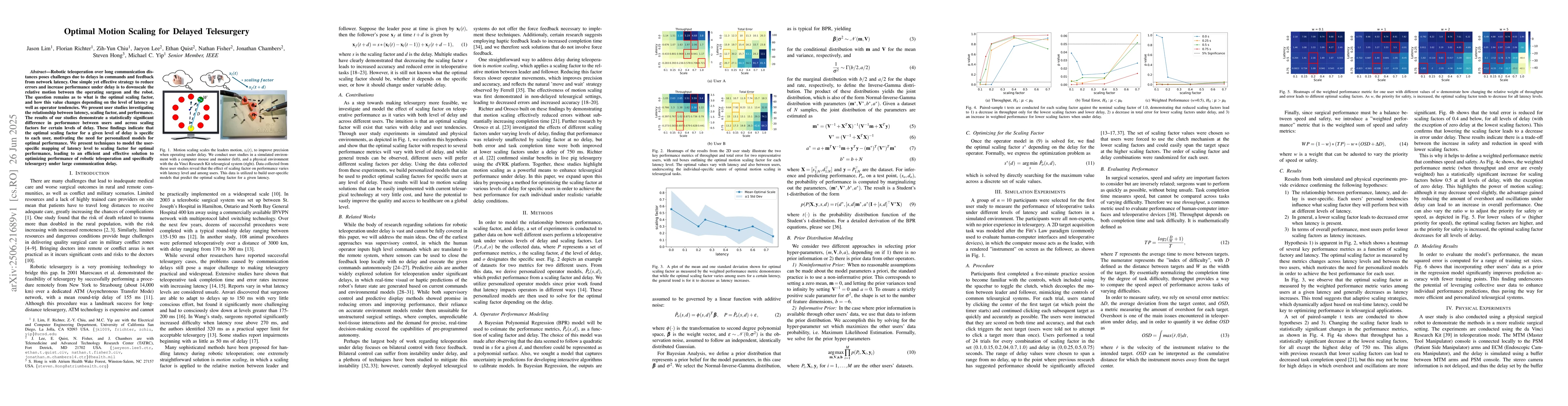 Robotic teleoperation over long communication distances poses challenges due to delays in commands and feedback from network latency. One simple yet effective strategy to reduce errors and increase performance under delay is to downscale the relative motion between the operating surgeon and the robot. The question remains as to what is the optimal scaling factor, and how this value changes depending on the level of latency as well as operator tendencies. We present user studies investigating the relationship between latency, scaling factor, and performance. The results of our studies demonstrate a statistically significant difference in performance between users and across scaling factors for certain levels of delay. These findings indicate that the optimal scaling factor for a given level of delay is specific to each user, motivating the need for personalized models for optimal performance. We present techniques to model the user-specific mapping of latency level to scaling factor for optimal performance, leading to an efficient and effective solution to optimizing performance of robotic teleoperation and specifically telesurgery under large communication delay.