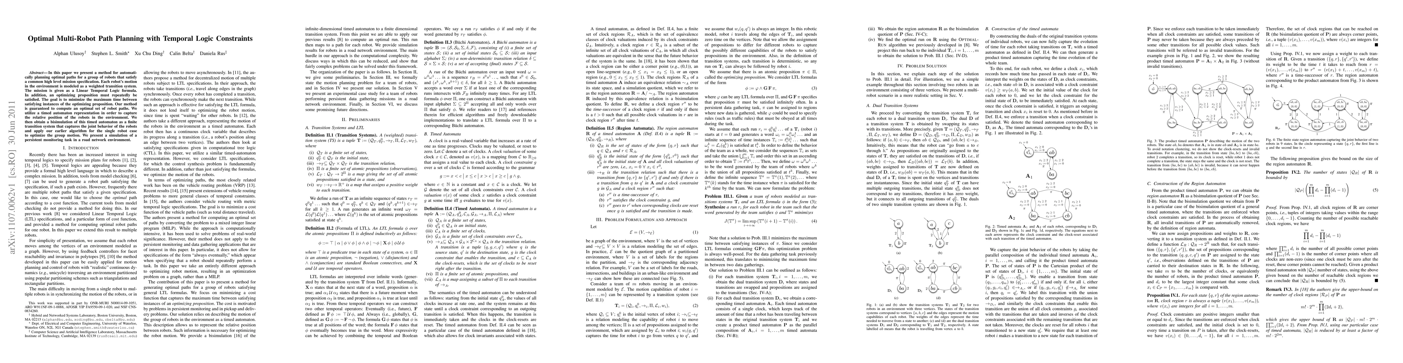 This paper proposes a method for planning optimal paths for multiple robots that satisfy high-level mission specifications defined by Linear Temporal Logic, while minimizing the maximum time between instances of an optimizing proposition. The approach uses timed automaton representation and bisimulation to capture and optimize the joint behavior of robots.