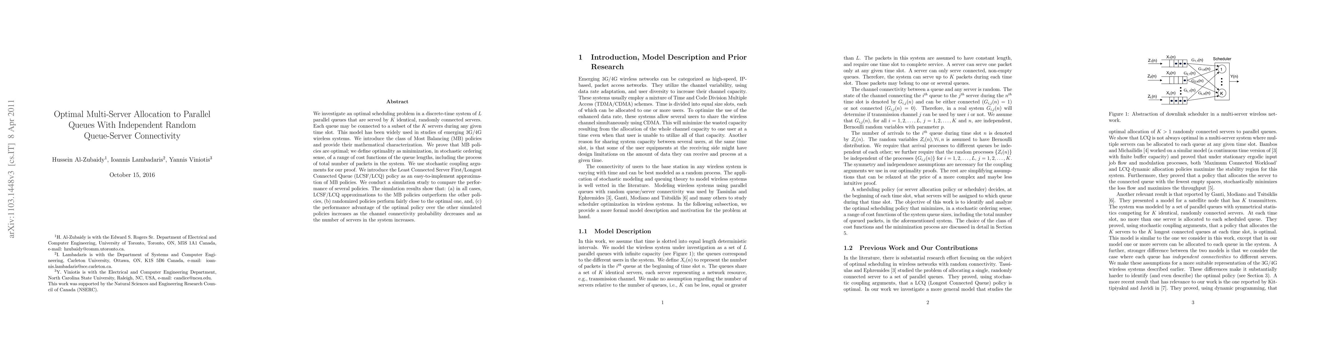 We investigate an optimal scheduling problem in a discrete-time system of L parallel queues that are served by K identical, randomly connected servers. Each queue may be connected to a subset of the K servers during any given time slot. This model has been widely used in studies of emerging 3G/4G wireless systems. We introduce the class of Most Balancing (MB) policies and provide their mathematical characterization. We prove that MB policies are optimal; we define optimality as minimization, in stochastic ordering sense, of a range of cost functions of the queue lengths, including the process of total number of packets in the system. We use stochastic coupling arguments for our proof. We introduce the Least Connected Server First/Longest Connected Queue (LCSF/LCQ) policy as an easy-to-implement approximation of MB policies. We conduct a simulation study to compare the performance of several policies. The simulation results show that: (a) in all cases, LCSF/LCQ approximations to the MB policies outperform the other policies, (b) randomized policies perform fairly close to the optimal one, and, (c) the performance advantage of the optimal policy over the other simulated policies increases as the channel connectivity probability decreases and as the number of servers in the system increases.