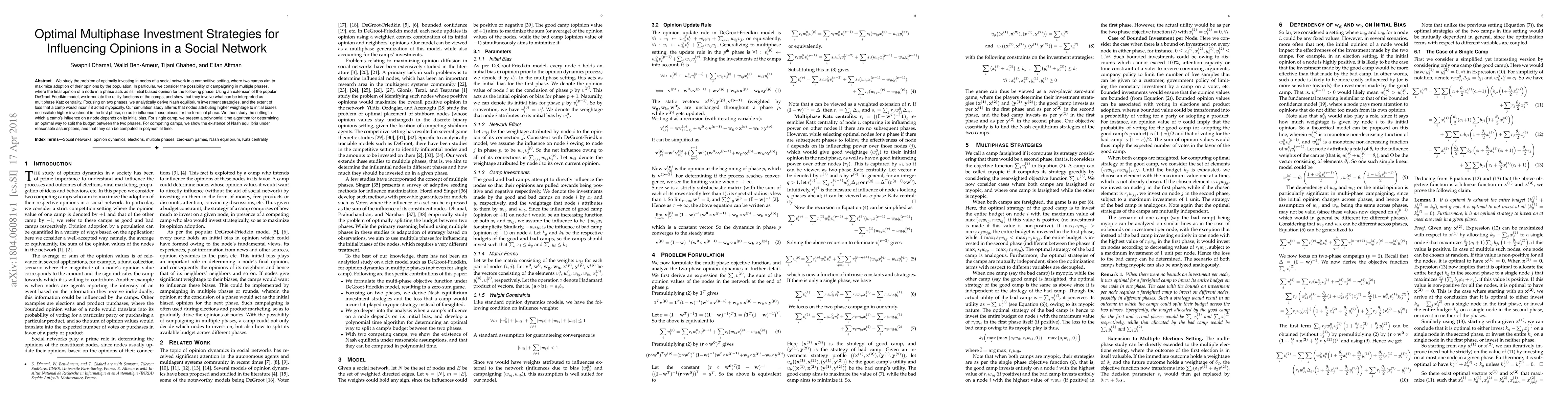 This paper investigates optimal investment strategies in a social network where two competing camps aim to maximize opinion adoption through multiphase campaigns. It derives Nash equilibrium strategies and demonstrates the importance of initial biases in influencing final opinions, presenting polynomial time algorithms for optimal budget allocation.
