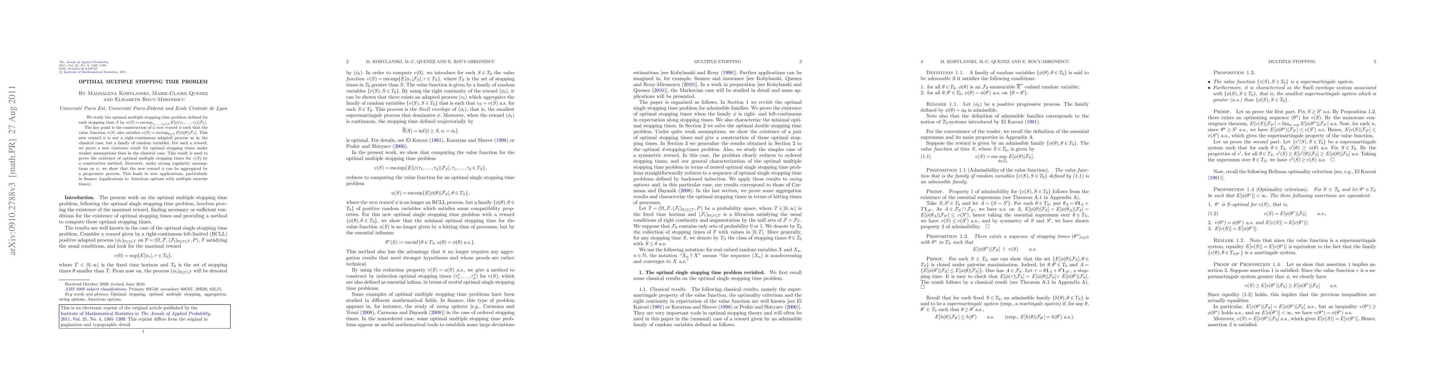 We study the optimal multiple stopping time problem defined for each stopping time $S$ by $v(S)=\operatorname {ess}\sup_{\tau_1,...,\tau_d\geq S}E[\psi(\tau_1,...,\tau_d)|\mathcal{F}_S]$. The key point is the construction of a new reward $\phi$ such that the value function $v(S)$ also satisfies $v(S)=\operatorname {ess}\sup_{\theta\geq S}E[\phi(\theta)|\mathcal{F}_S]$. This new reward $\phi$ is not a right-continuous adapted process as in the classical case, but a family of random variables. For such a reward, we prove a new existence result for optimal stopping times under weaker assumptions than in the classical case. This result is used to prove the existence of optimal multiple stopping times for $v(S)$ by a constructive method. Moreover, under strong regularity assumptions on $\psi$, we show that the new reward $\phi$ can be aggregated by a progressive process. This leads to new applications, particularly in finance (applications to American options with multiple exercise times).