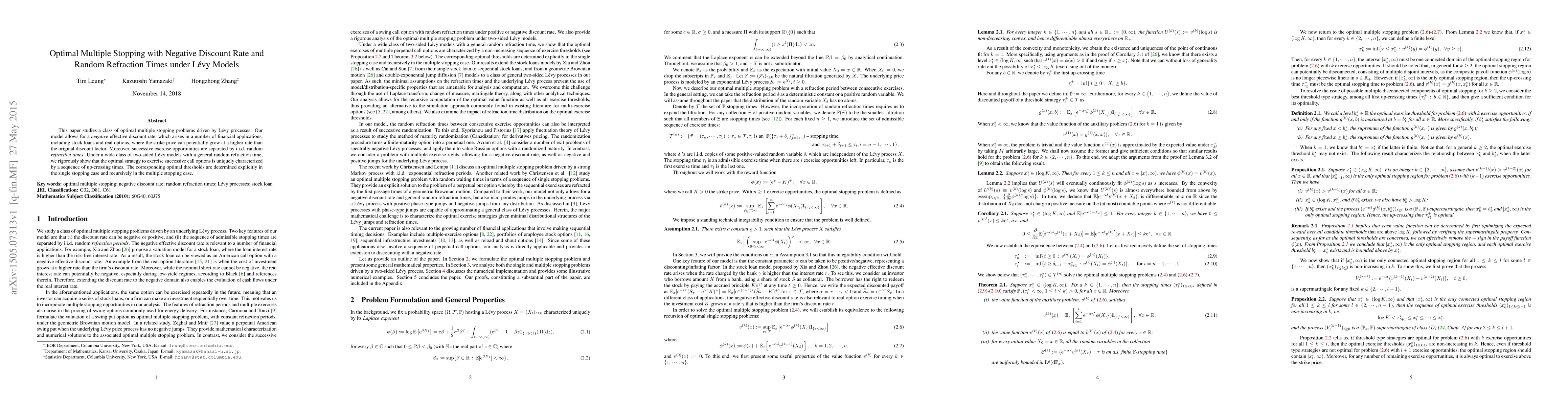 This paper investigates optimal multiple stopping strategies under Lévy models with a negative effective discount rate and random refraction times. It demonstrates that the optimal exercise strategy for successive call options is characterized by a sequence of up-crossing times, with explicit and recursive determination of optimal thresholds.