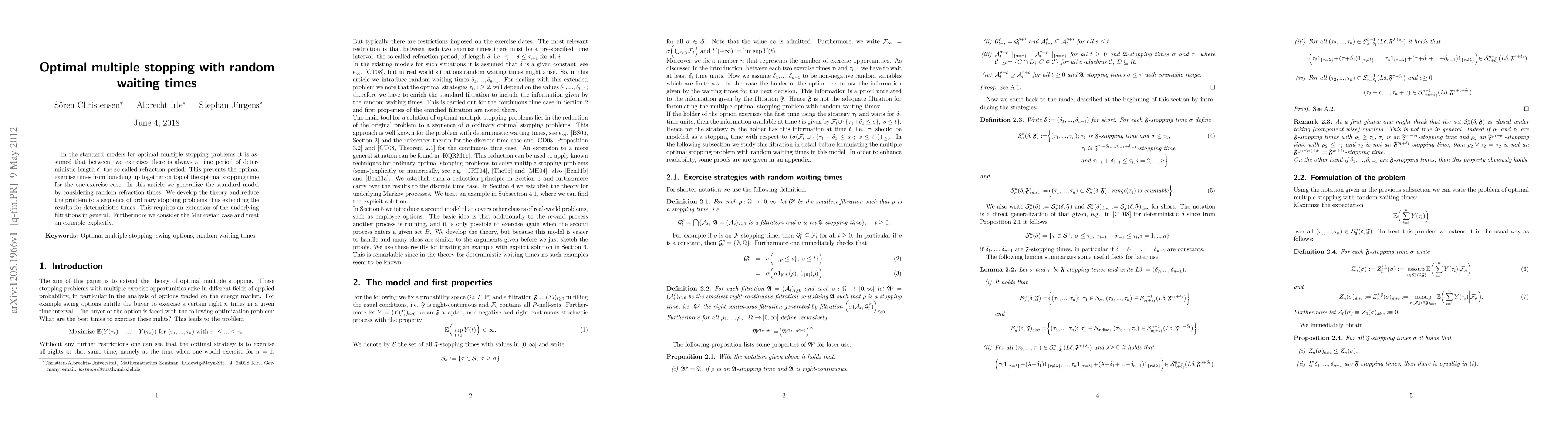 This paper generalizes optimal multiple stopping models by introducing random waiting times instead of deterministic intervals, developing a new theory that reduces the problem to a series of ordinary stopping problems. It also extends the results to Markovian cases and provides an explicit example.