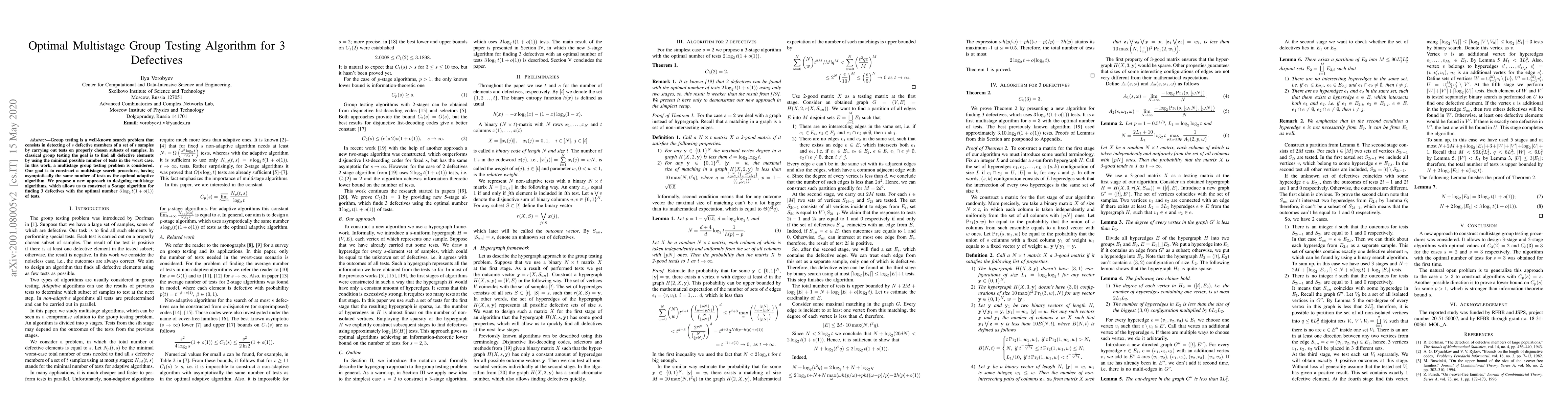 This paper proposes a new multistage group testing algorithm to detect 3 defectives among $t$ samples, achieving the optimal number of tests, $3\log_2t(1+o(1))$, through a 5-stage procedure that matches the performance of the best adaptive algorithms.