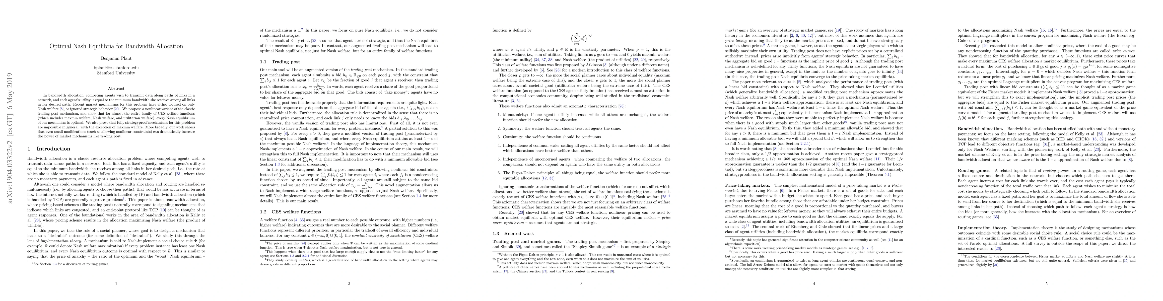 In bandwidth allocation, competing agents wish to transmit data along paths of links in a network, and each agent's utility is equal to the minimum bandwidth she receives among all links in her desired path. Recent market mechanisms for this problem have either focused on only Nash welfare, or ignored strategic behavior. We propose a nonlinear variant of the classic trading post mechanism, and show that for almost the entire family of CES welfare functions (which includes maxmin welfare, Nash welfare, and utilitarian welfare), every Nash equilibrium of our mechanism is optimal. We also prove that fully strategyproof mechanisms for this problem are impossible in general, with the exception of maxmin welfare. More broadly, our work shows that even small modifications (such as allowing nonlinear constraints) can dramatically increase the power of market mechanisms like trading post.