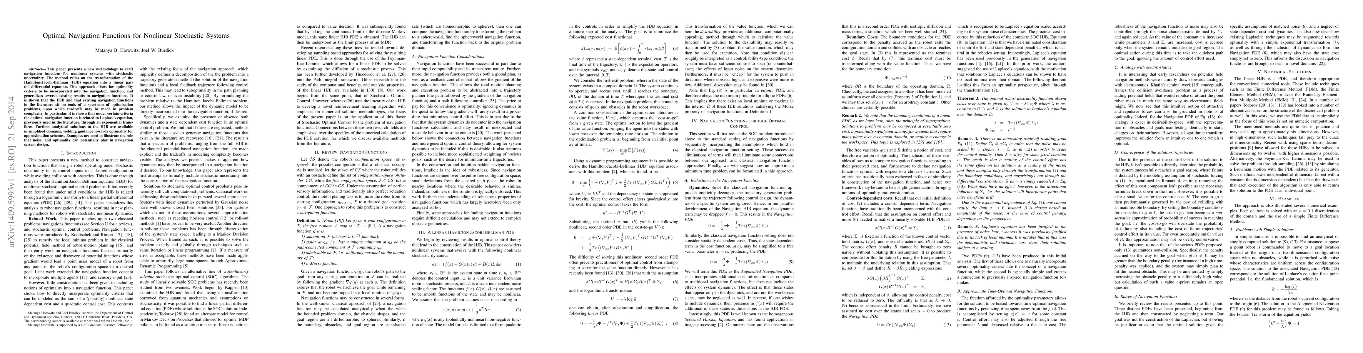 A new methodology transforms the Hamilton-Jacobi-Bellman equation into a linear partial differential equation to craft navigation functions for nonlinear stochastic systems. This approach generalizes existing results and provides insight into tradeoffs between problem complexity and optimality.